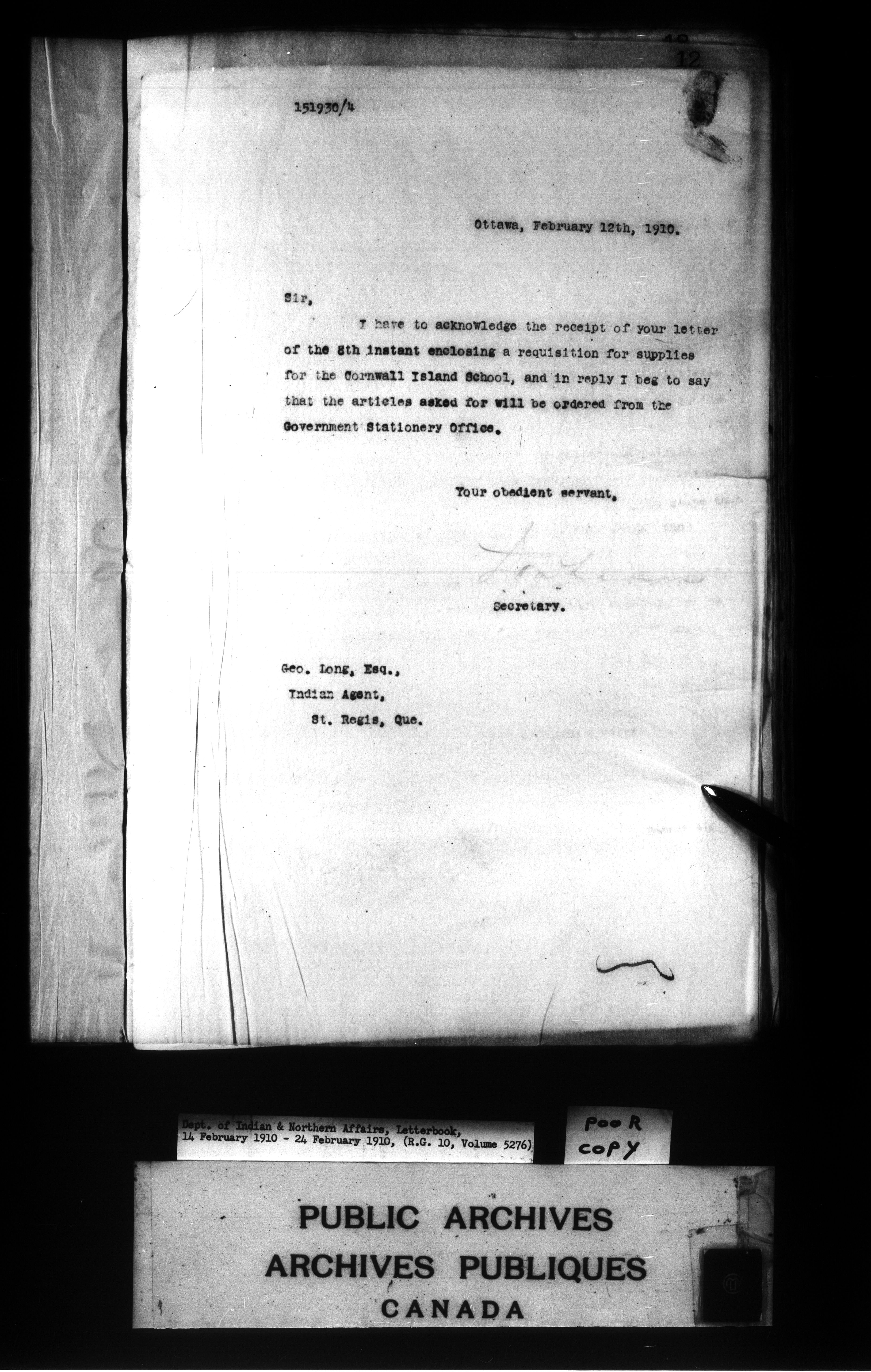 Department of Indian Affairs : Letterbooks of out-going correspondence relating to the administration of Indian Affairs in both eastern and western Canada, 1871-1920 - 7510