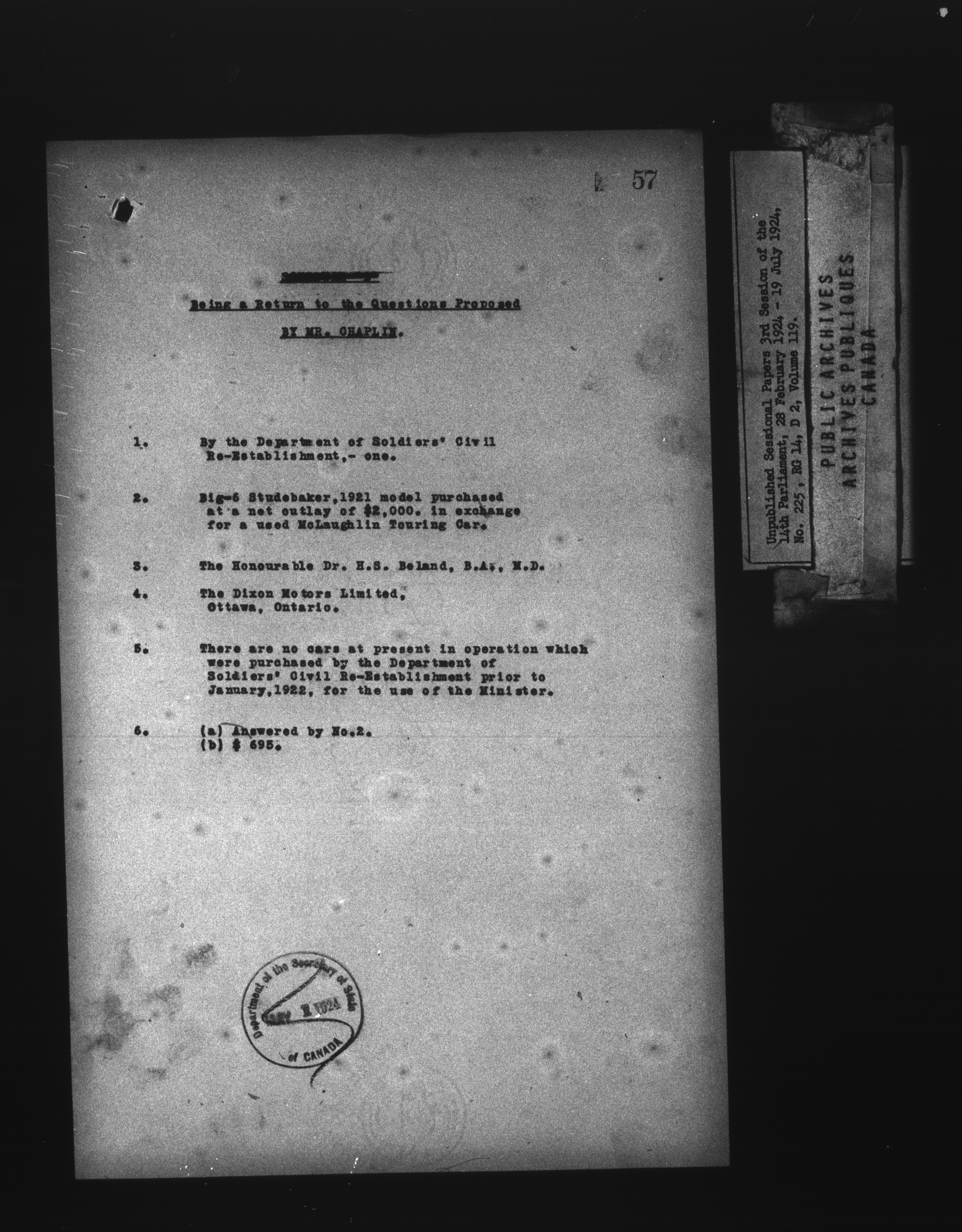 Unpublished sessional papers, 3rd Session of the 14th Parliament, 28 February - 19 July 1924 - 7518