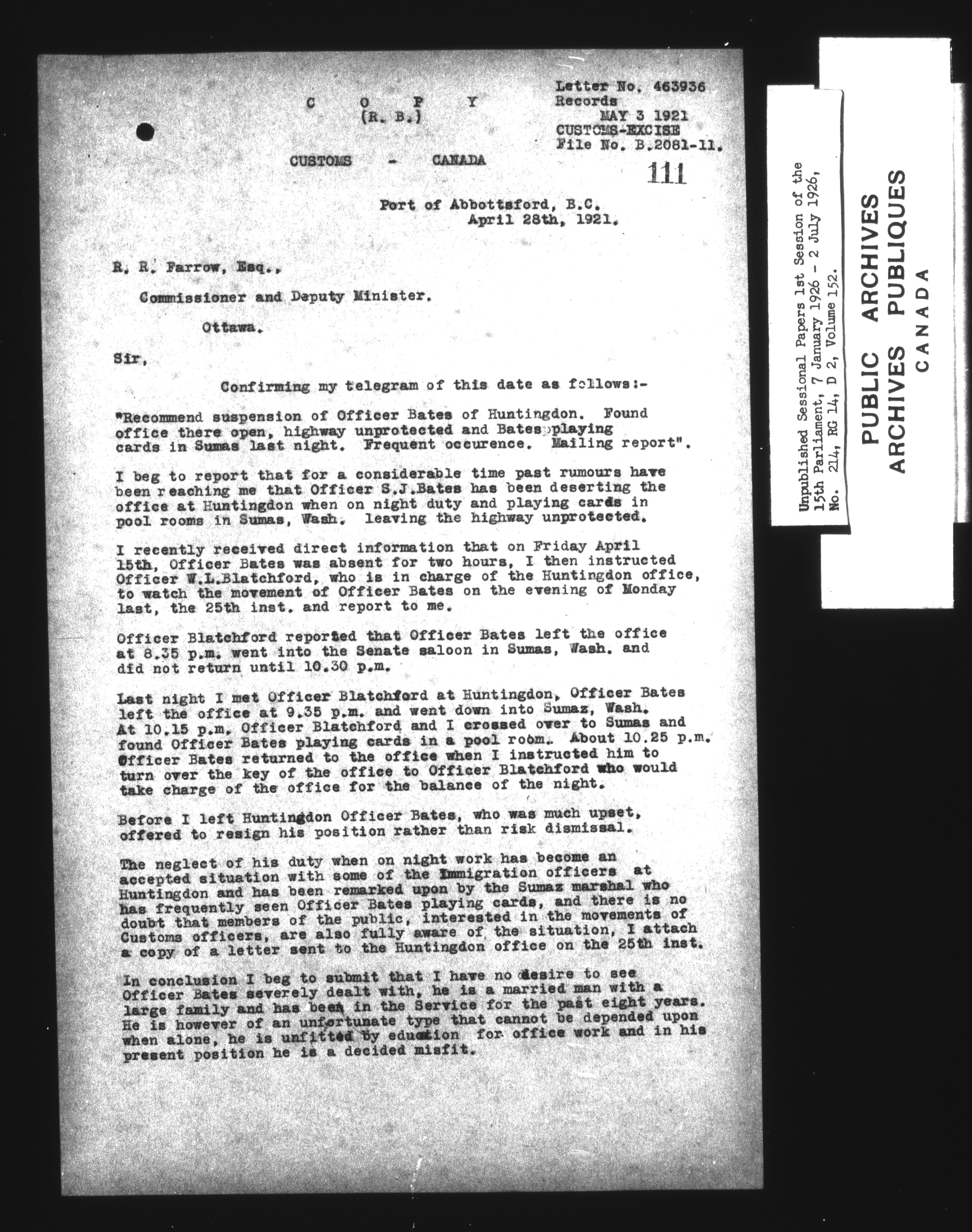 Unpublished sessional papers, 4th session of the 14th Parliament, 5 February - 27 June 1925 - 7540