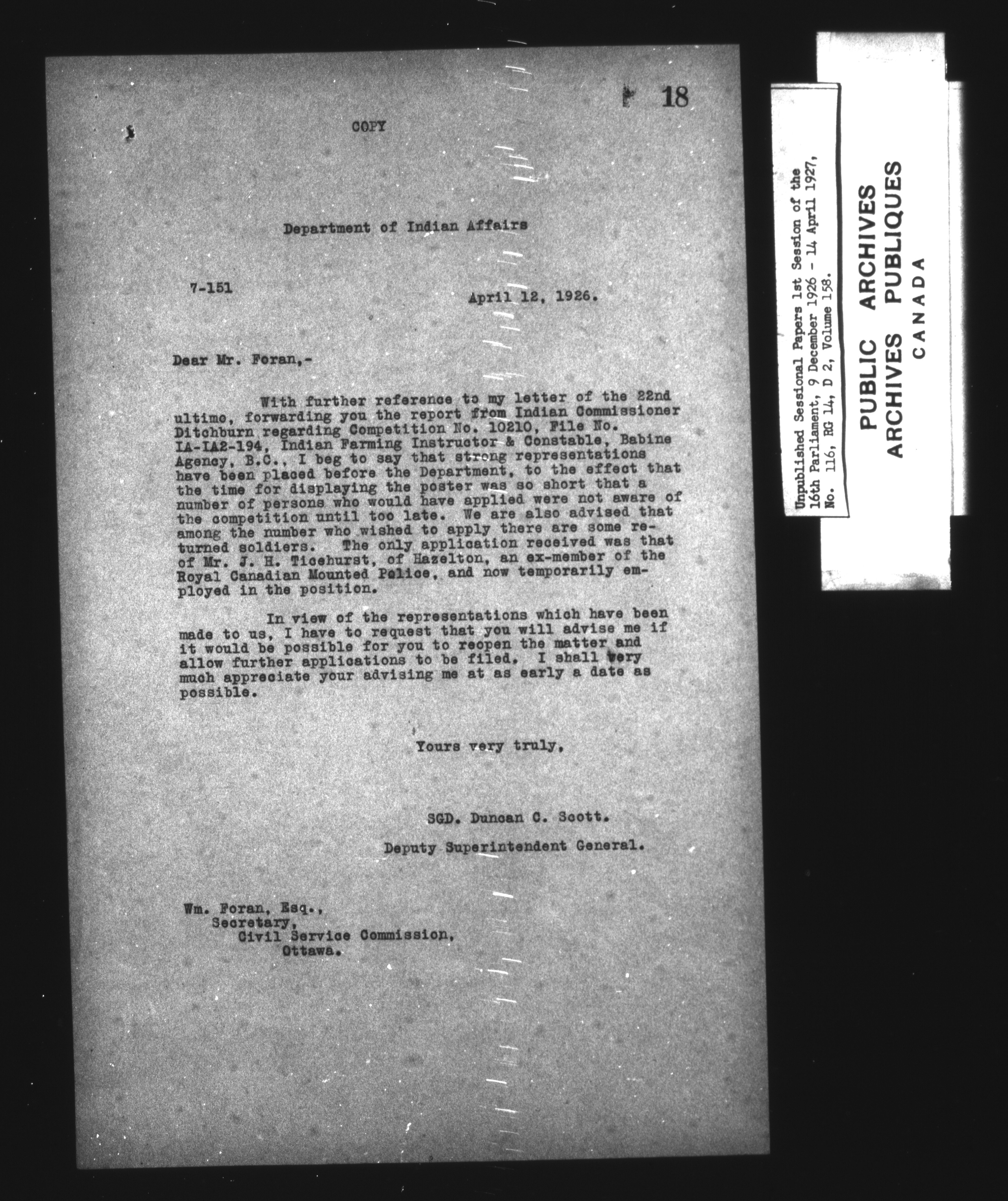 Unpublished sessional papers, 1st session of the 16th Parliament, 9 December 1926 - 14 April 1927 - 7541