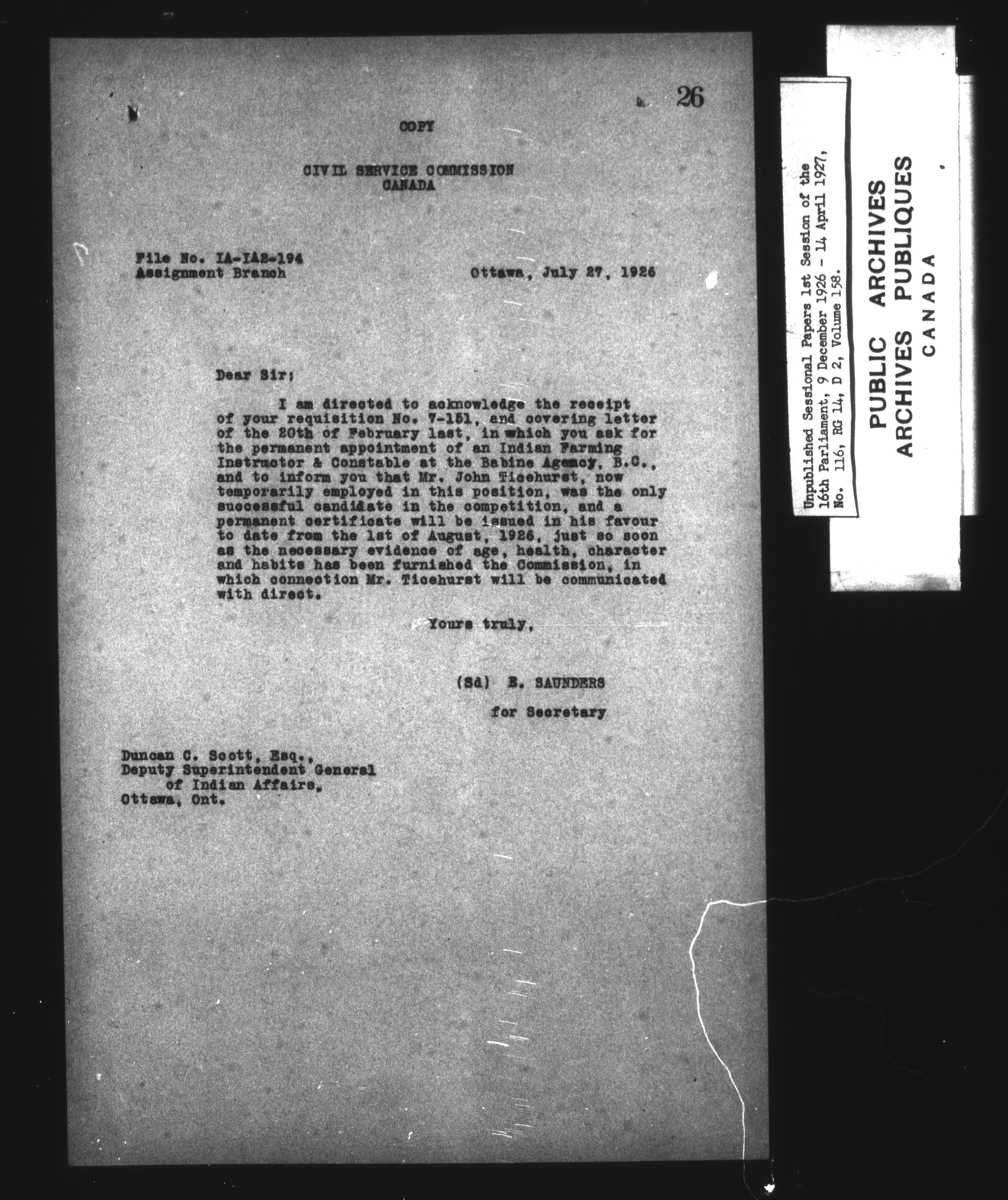 Unpublished sessional papers, 1st session of the 16th Parliament, 9 December 1926 - 14 April 1927 - 7541