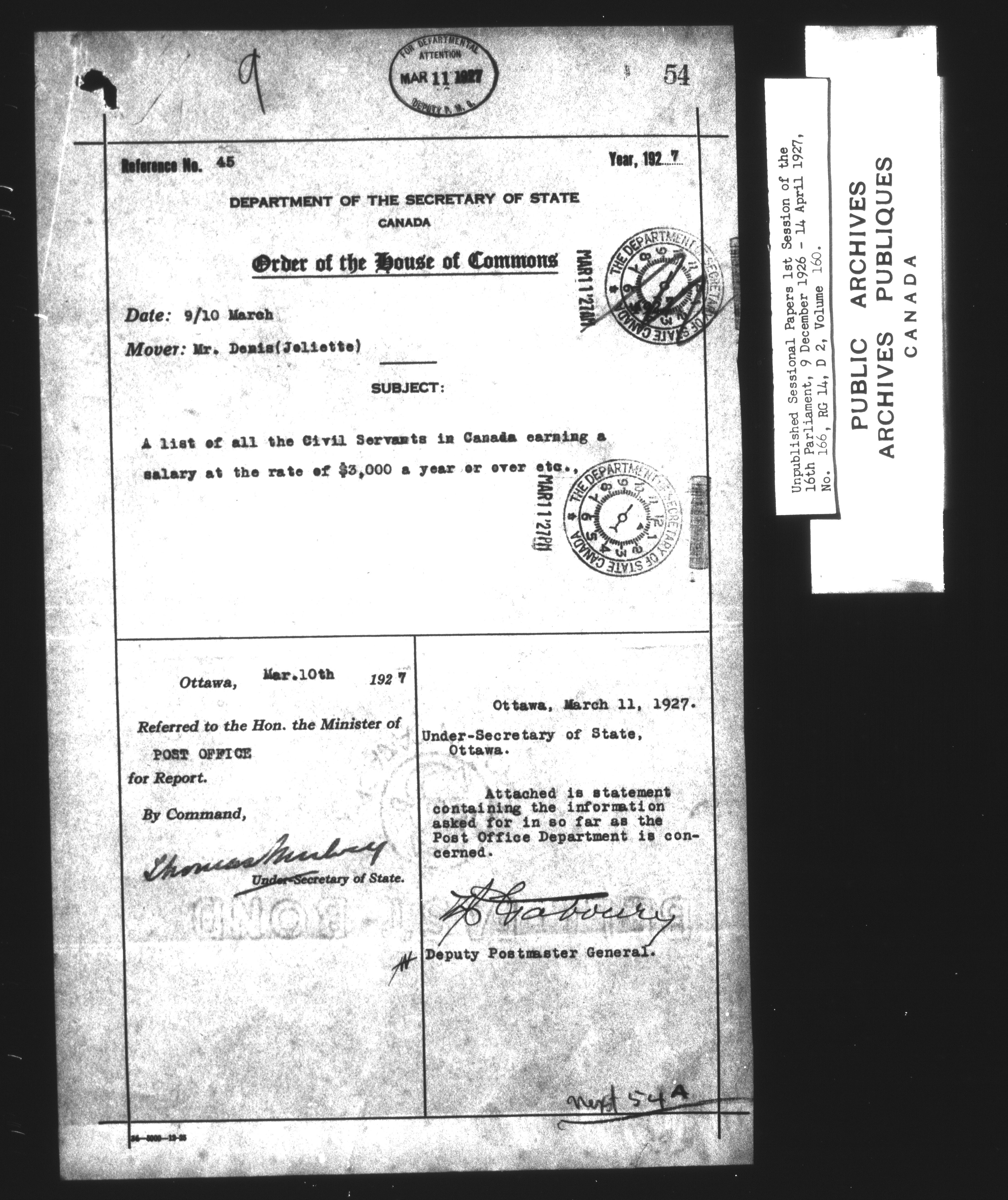 Unpublished sessional papers, 1st session of the 16th Parliament, 9 December 1926 - 14 April 1927 - 7542