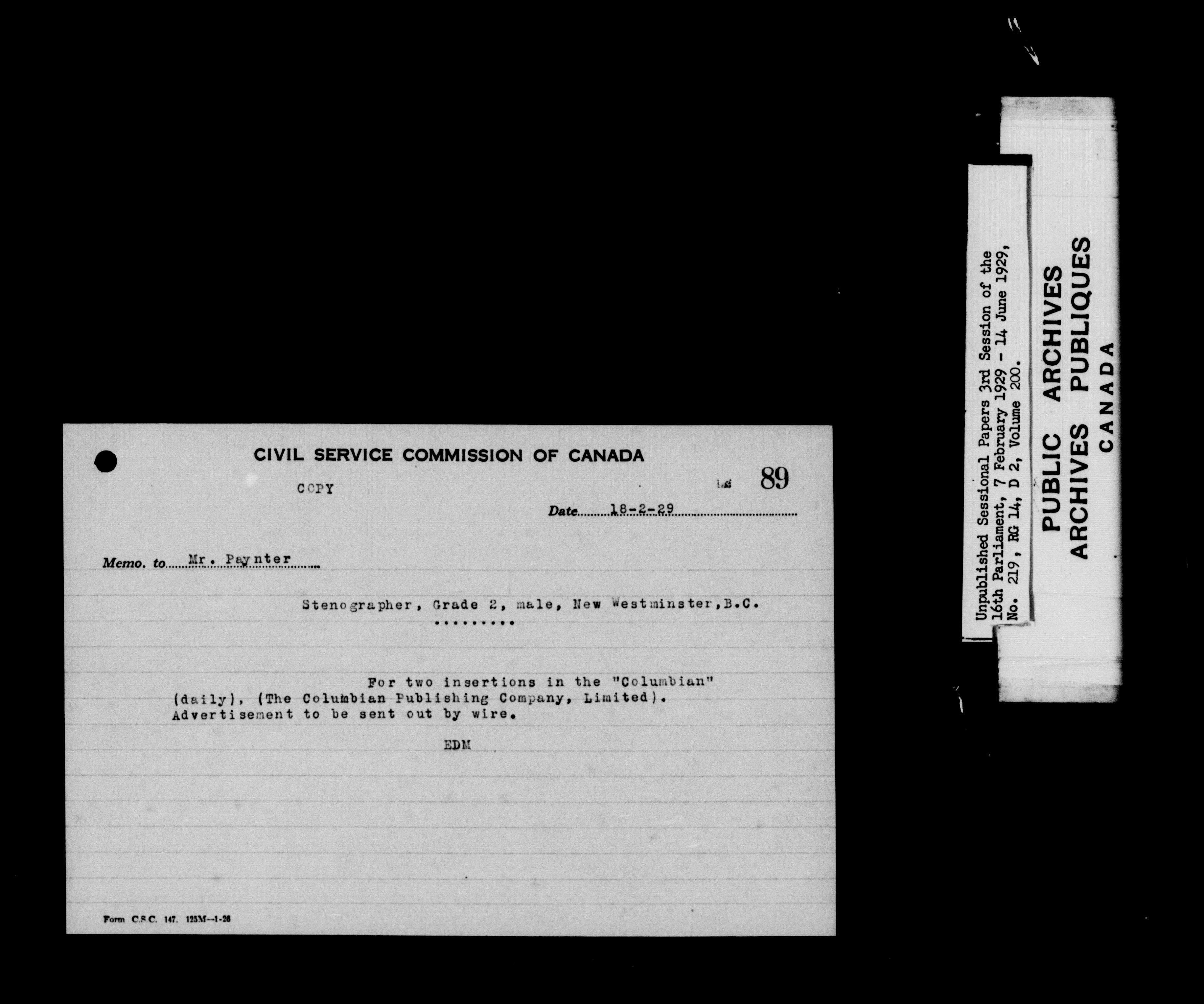 Unpublished sessional papers, 3rd session of the 16th Parliament, 7 February - 14 June 1929 - 7565