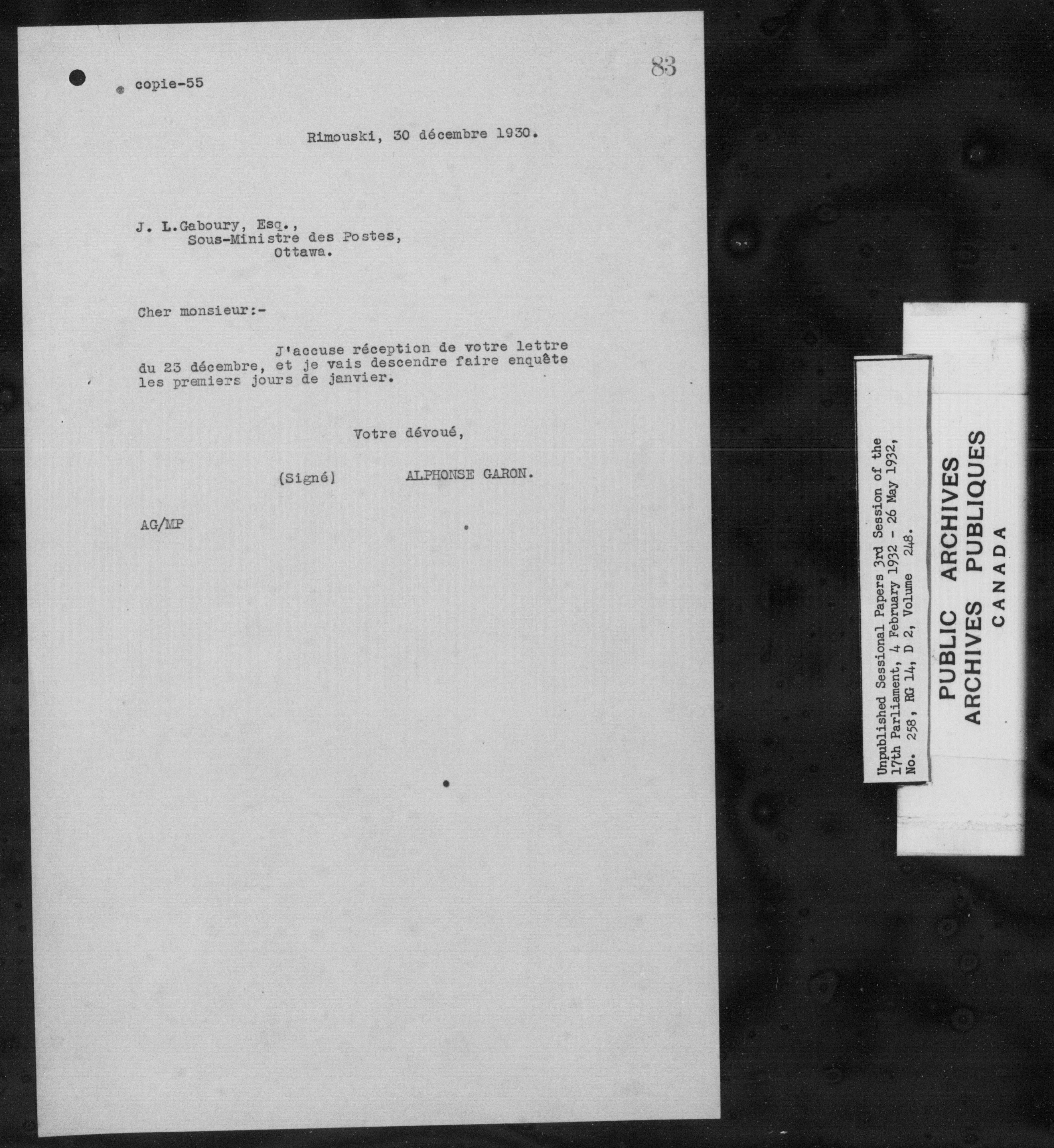 Unpublished sessional papers, 3rd session of the 17th Parliament, 4 February - 26 May 1932 - 7588