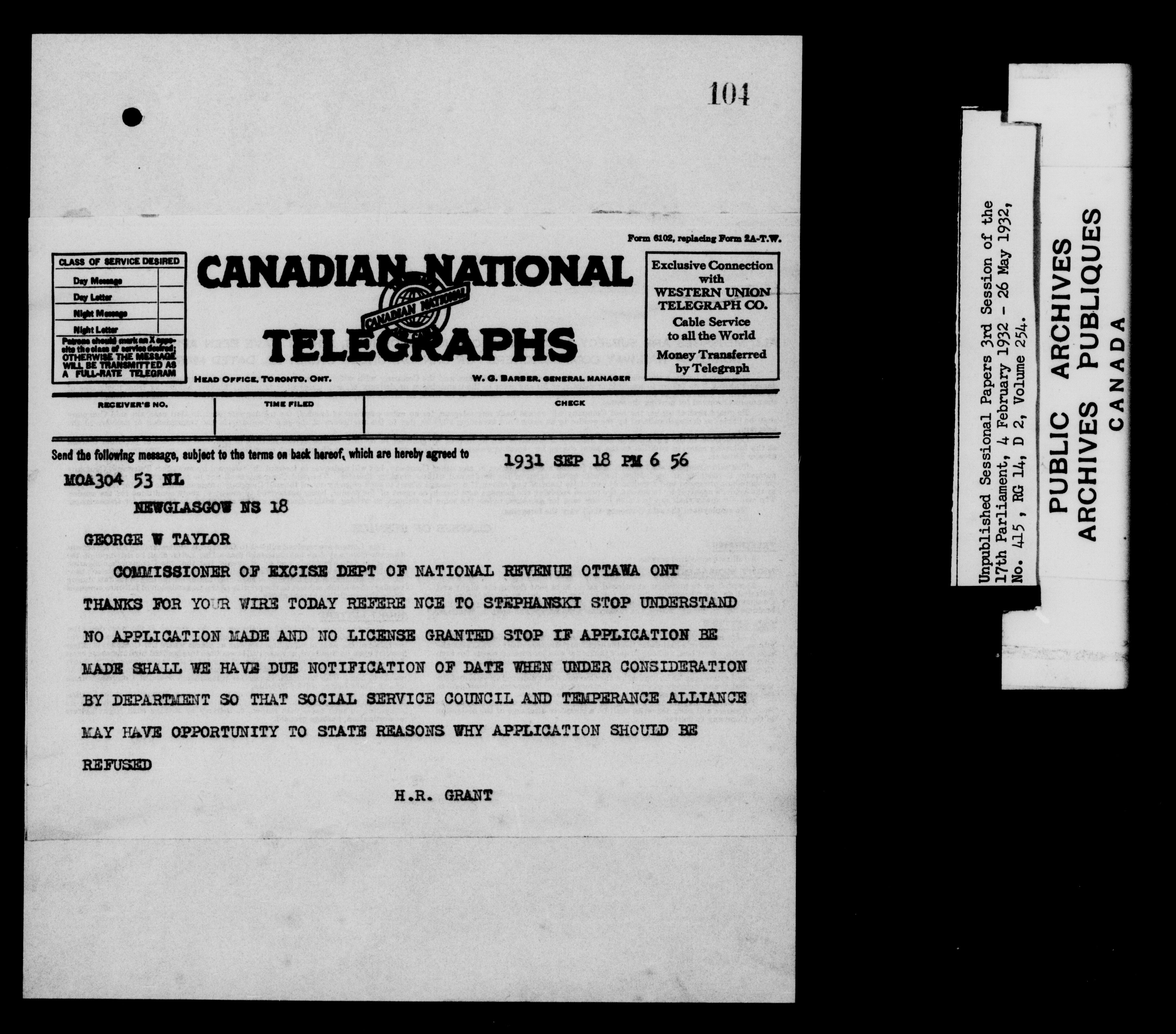 Unpublished sessional papers, 3rd session of the 17th Parliament, 4 February - 26 May 1932 - 7592