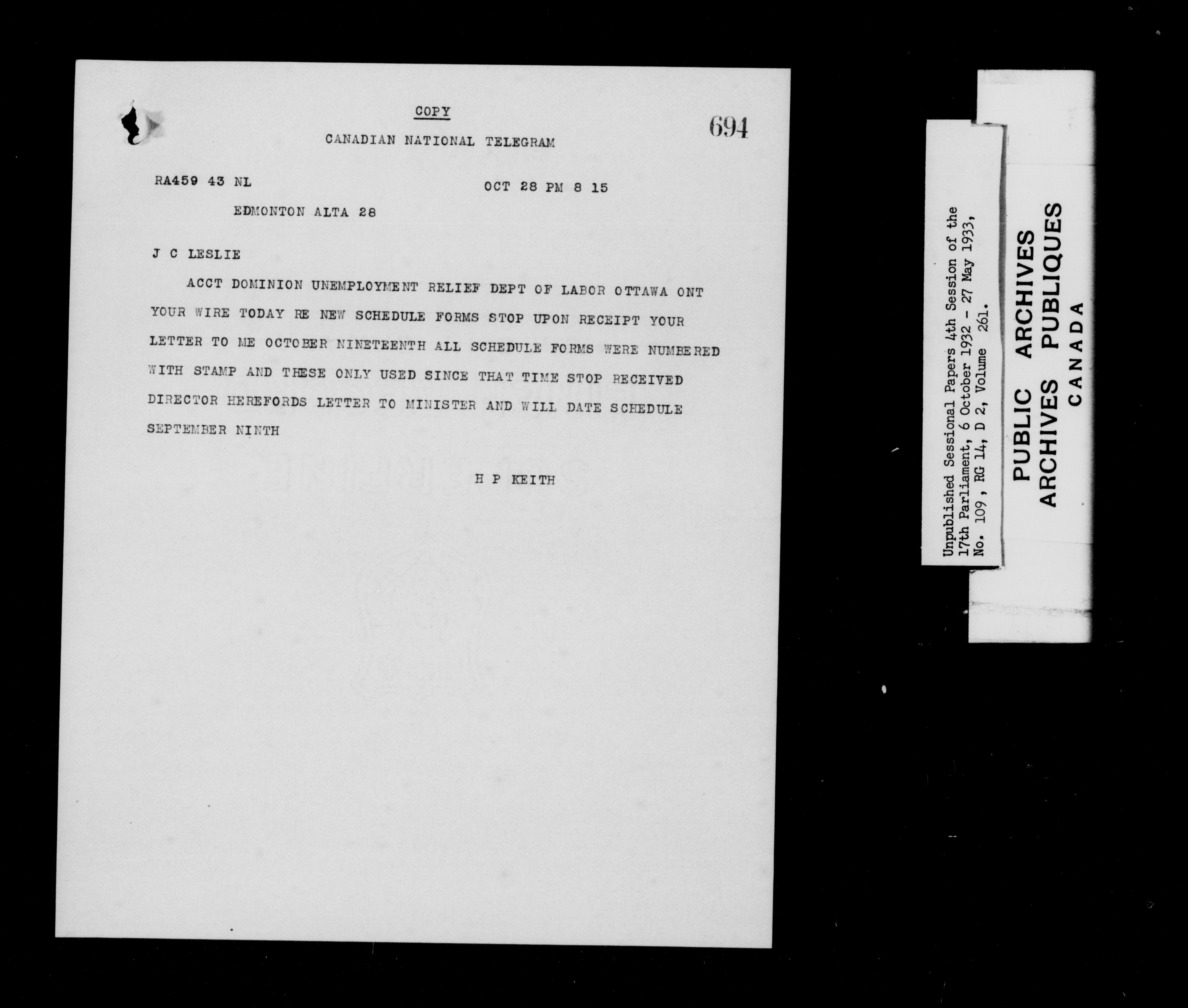 Unpublished sessional papers, 4th session of the 17th Parliament, 6 October 1932 - 27 May 1933 - 7594