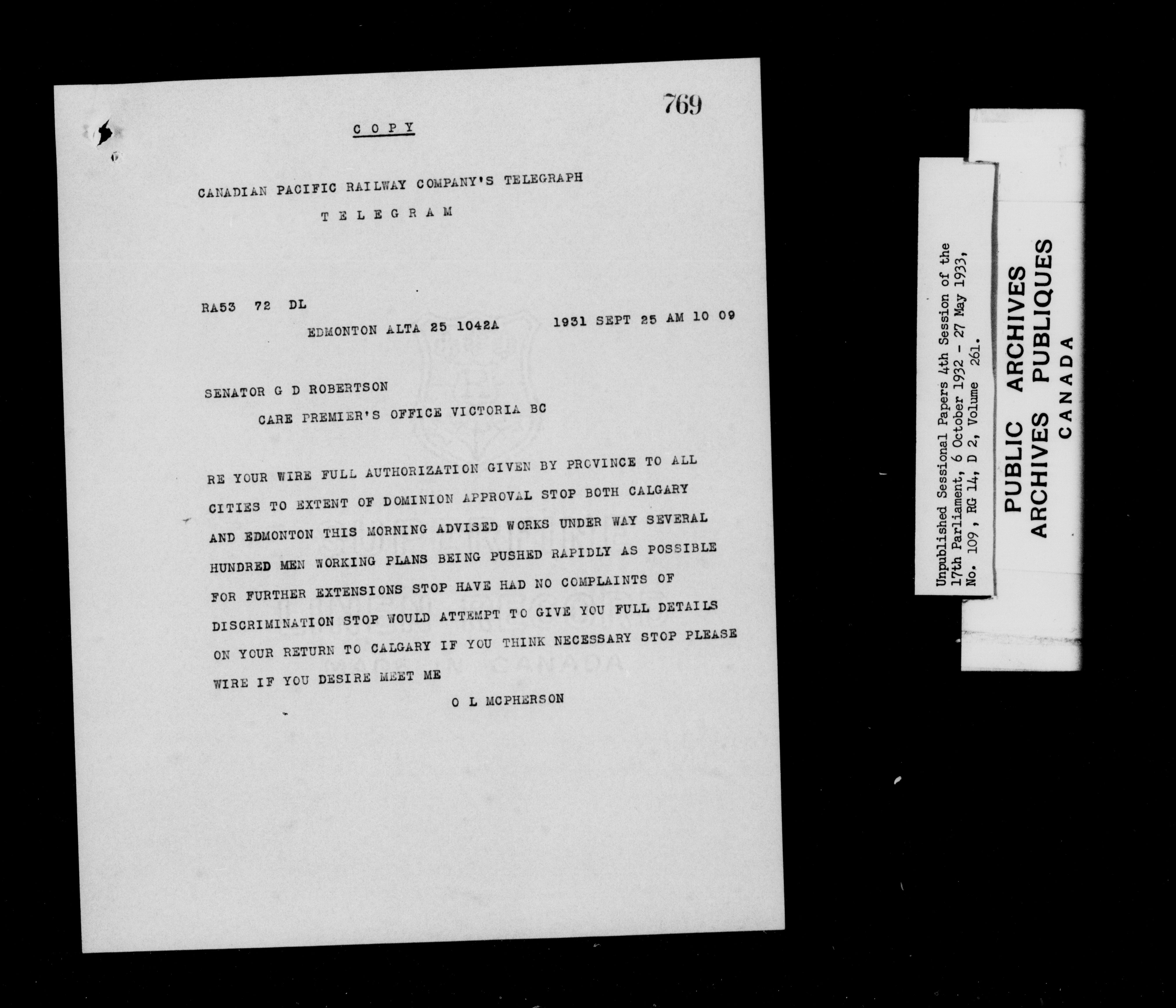 Unpublished sessional papers, 4th session of the 17th Parliament, 6 October 1932 - 27 May 1933 - 7594