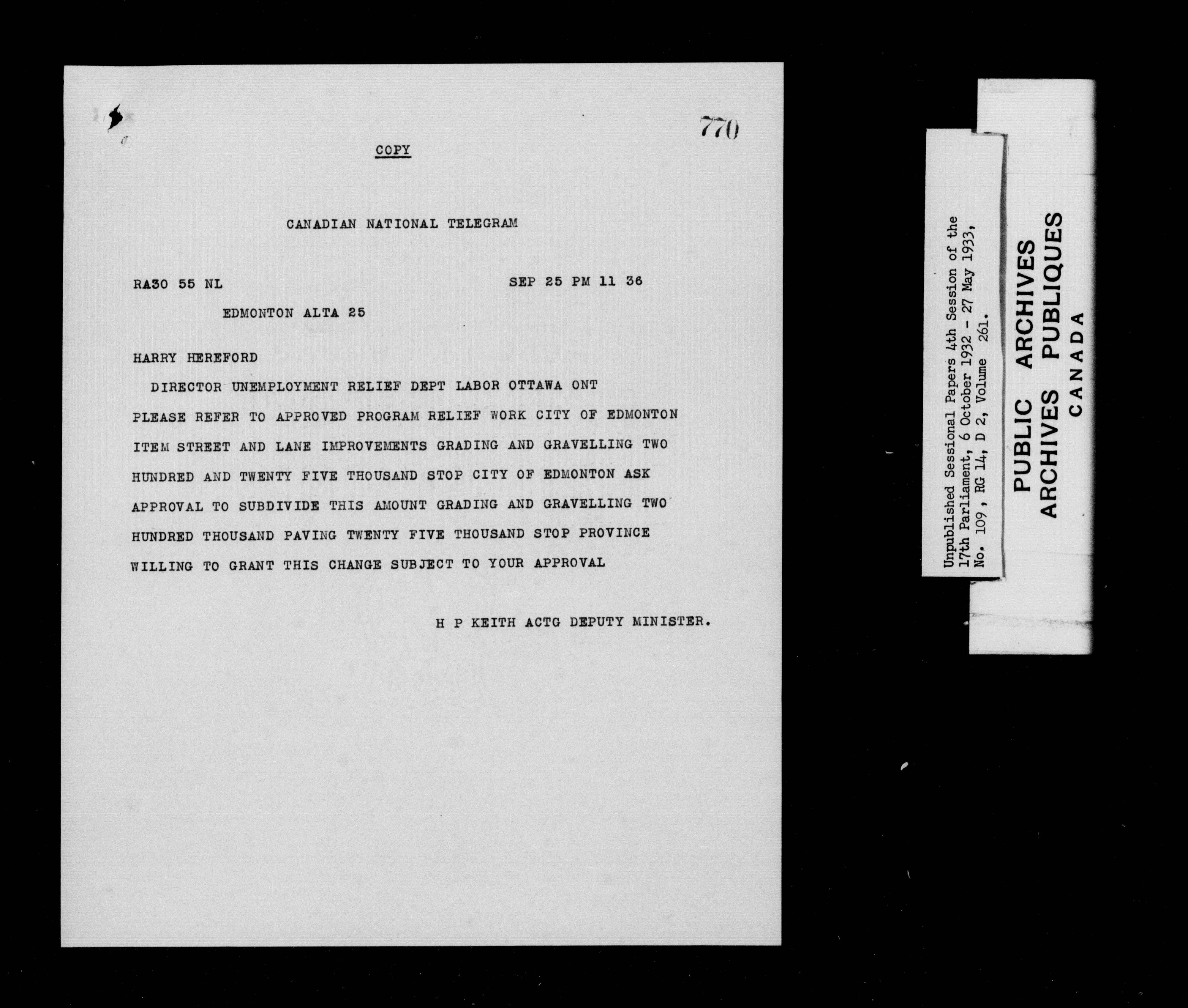 Unpublished sessional papers, 4th session of the 17th Parliament, 6 October 1932 - 27 May 1933 - 7594