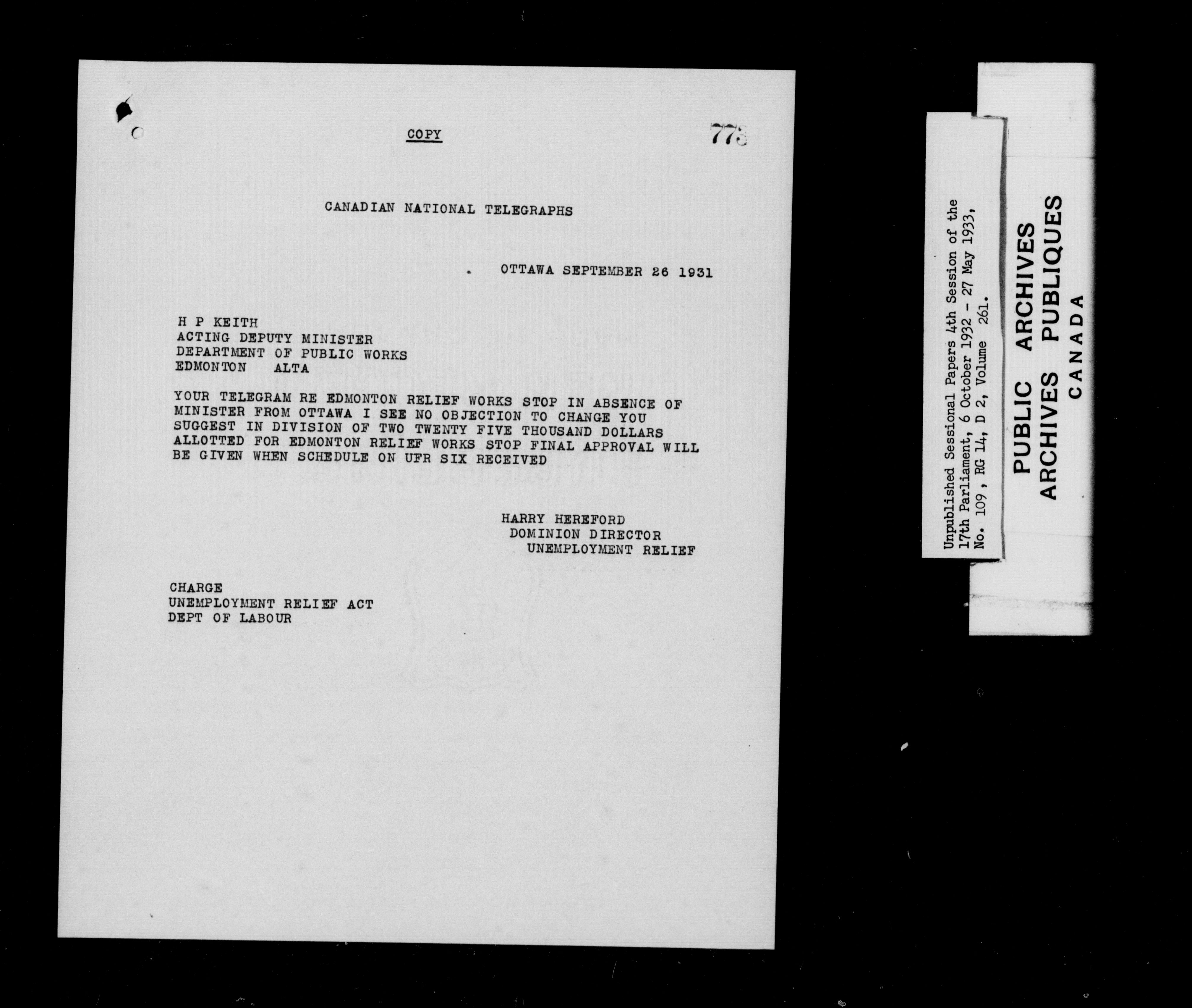 Unpublished sessional papers, 4th session of the 17th Parliament, 6 October 1932 - 27 May 1933 - 7594