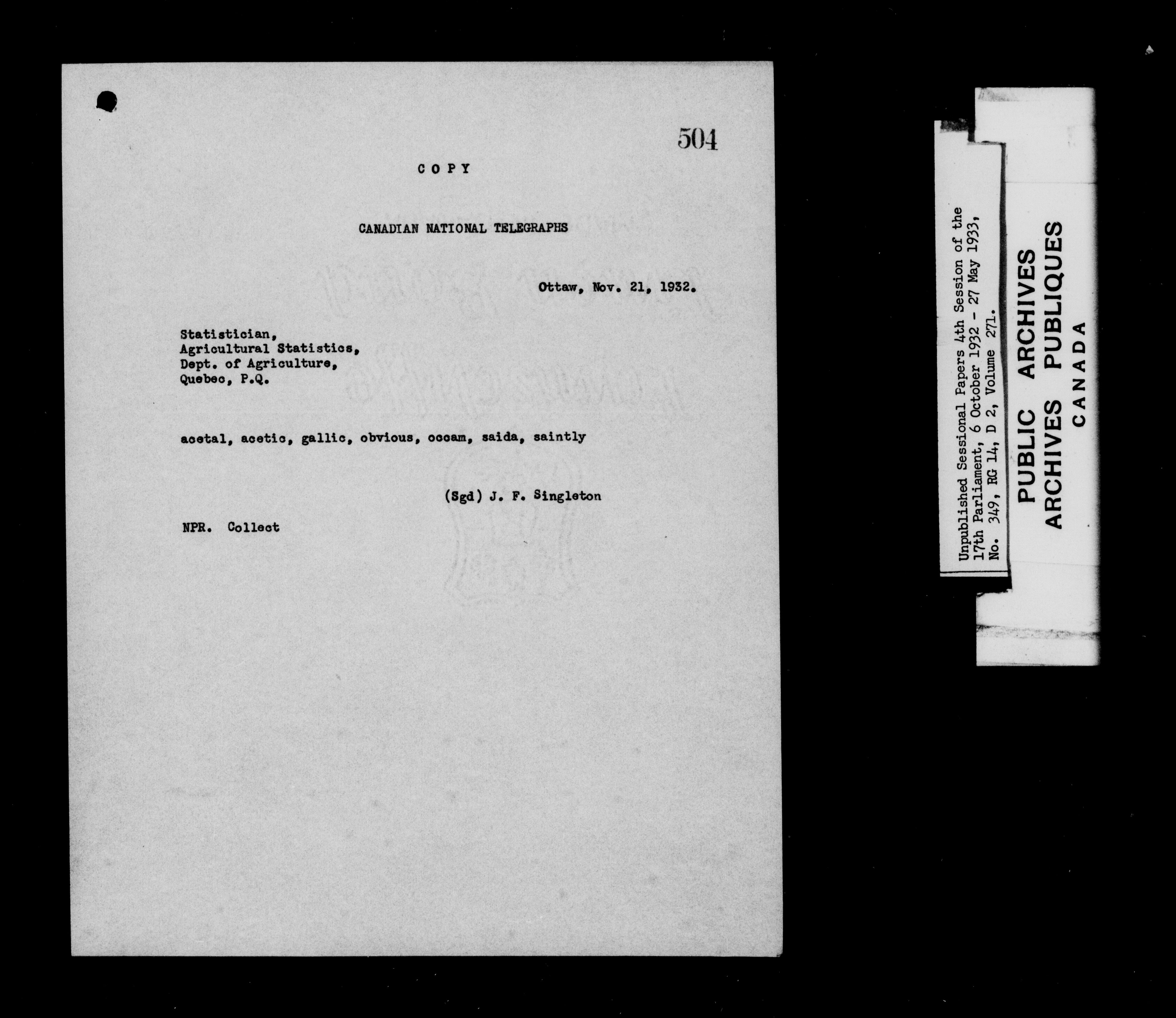 Unpublished sessional papers, 4th session of the 17th Parliament, 6 October 1932 - 27 May 1933 - 7600