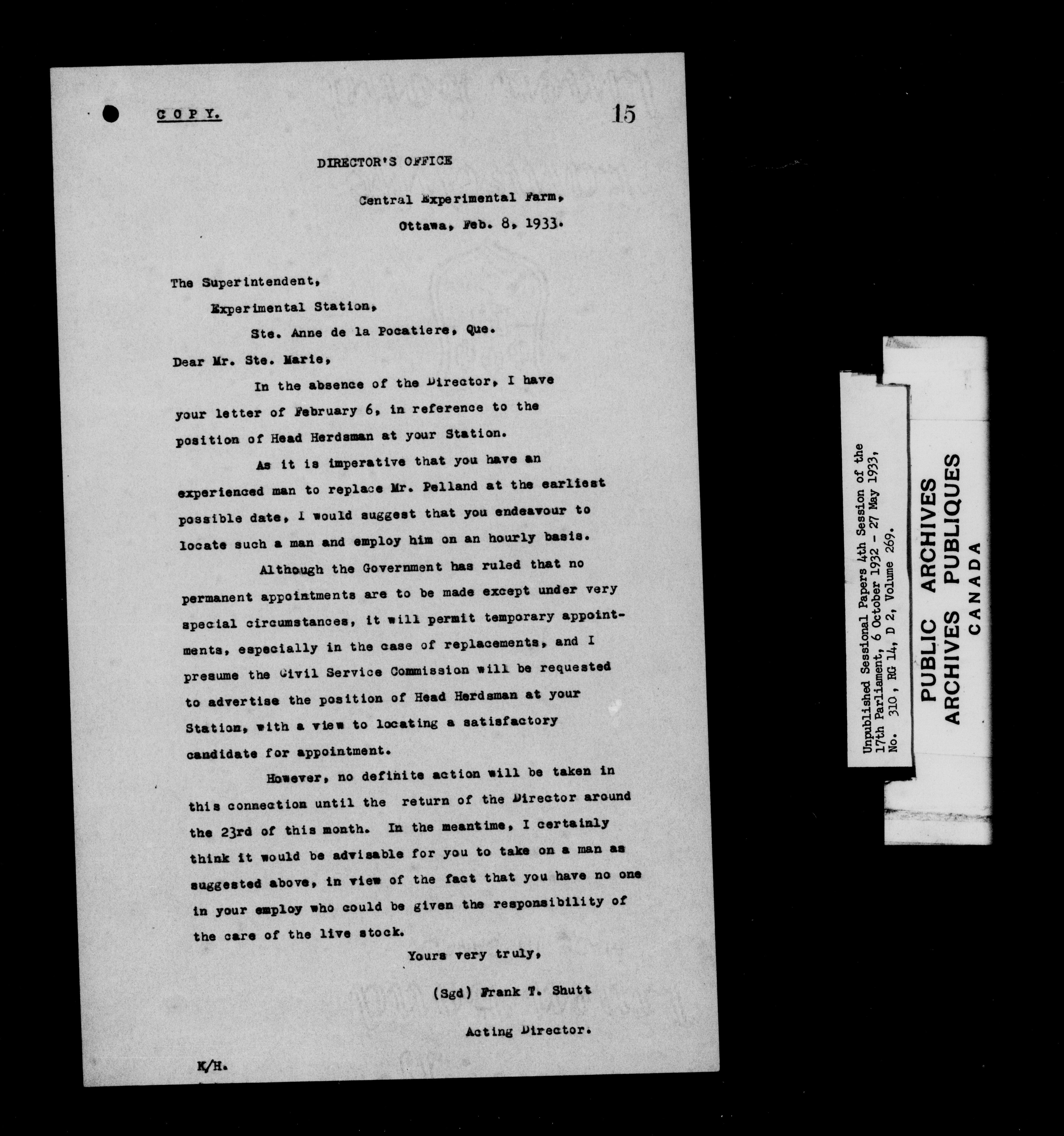 Unpublished sessional papers, 4th session of the 17th Parliament, 6 October 1932 - 27 May 1933 - 7600