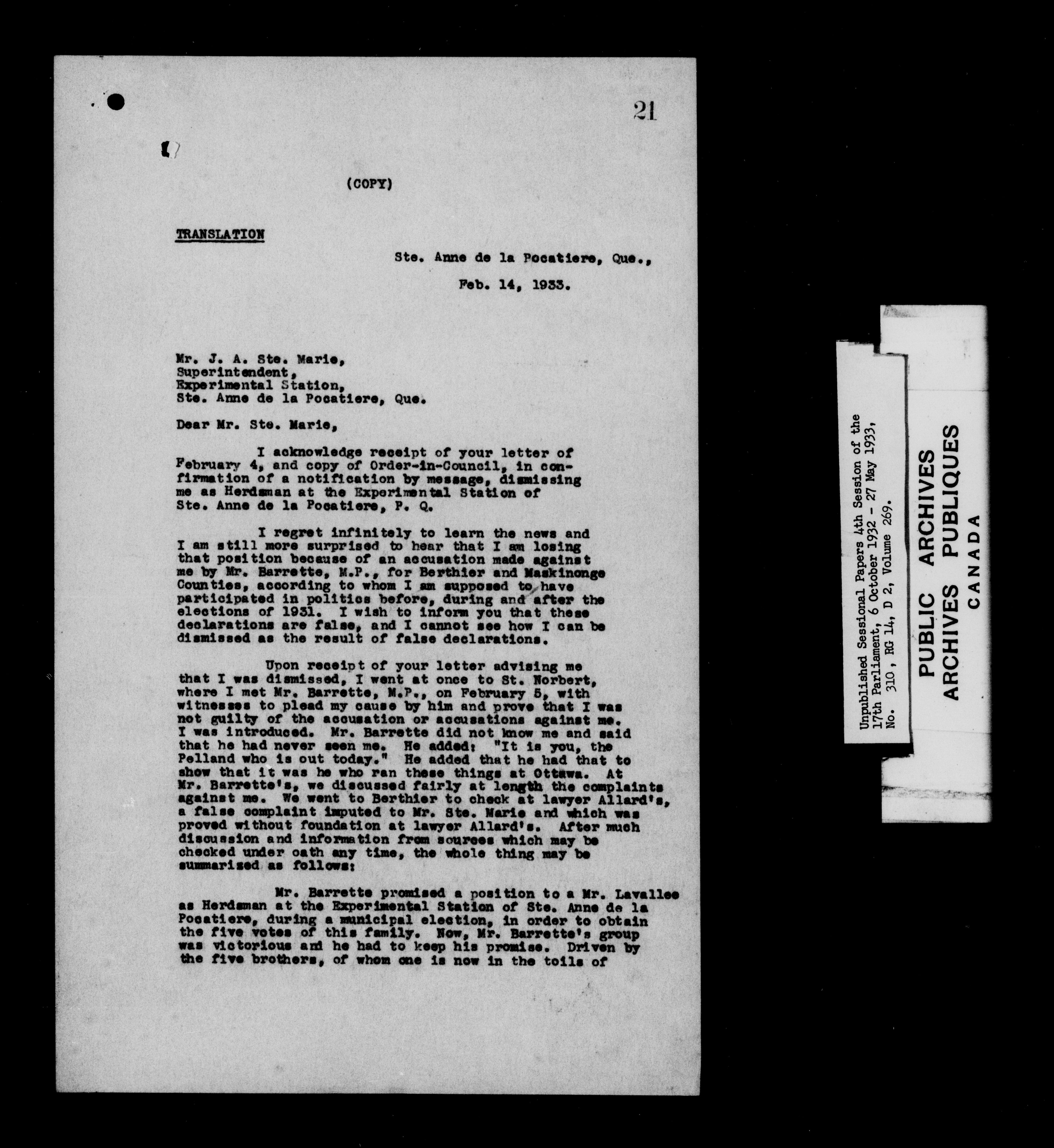 Unpublished sessional papers, 4th session of the 17th Parliament, 6 October 1932 - 27 May 1933 - 7600