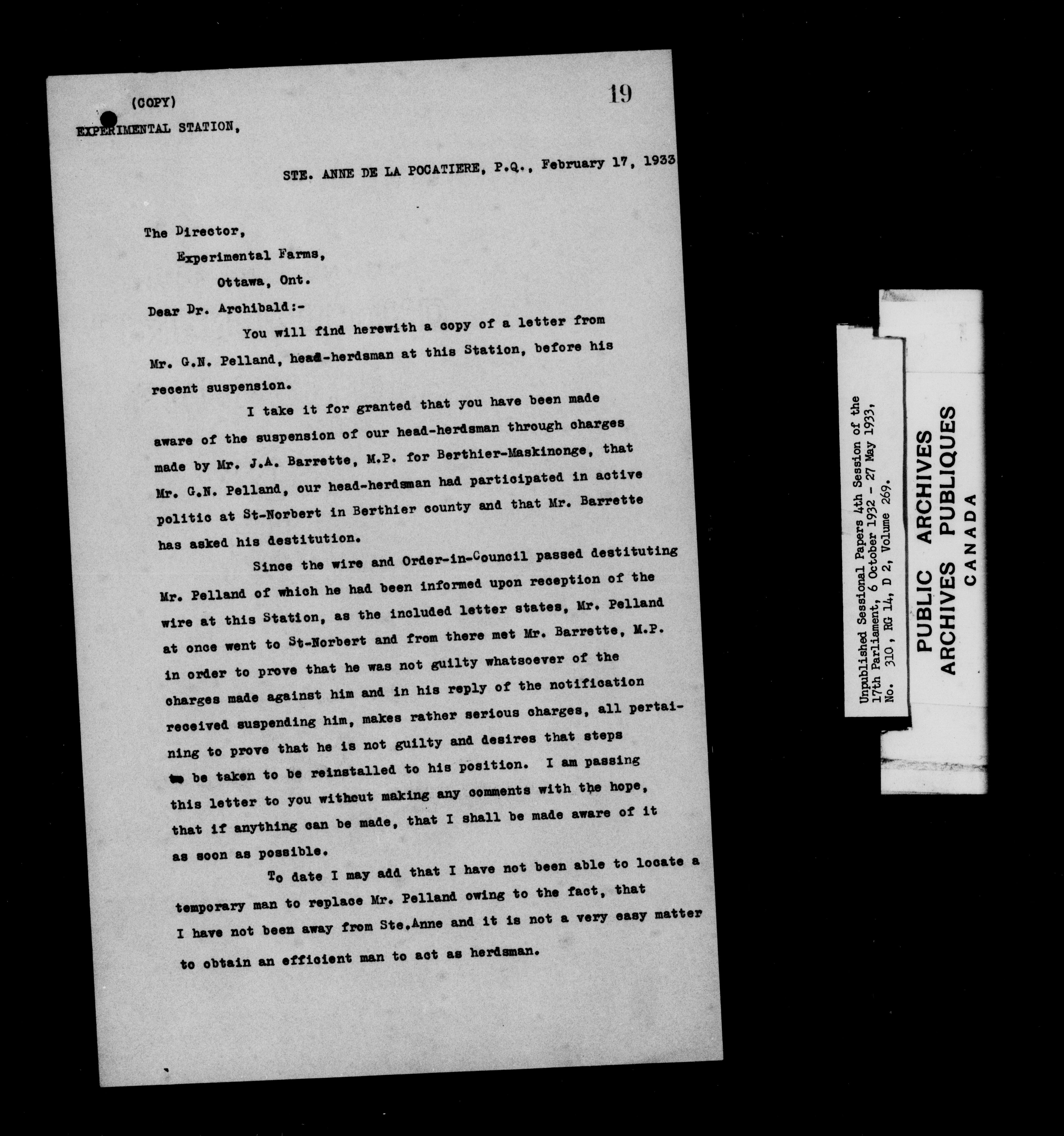 Unpublished sessional papers, 4th session of the 17th Parliament, 6 October 1932 - 27 May 1933 - 7600