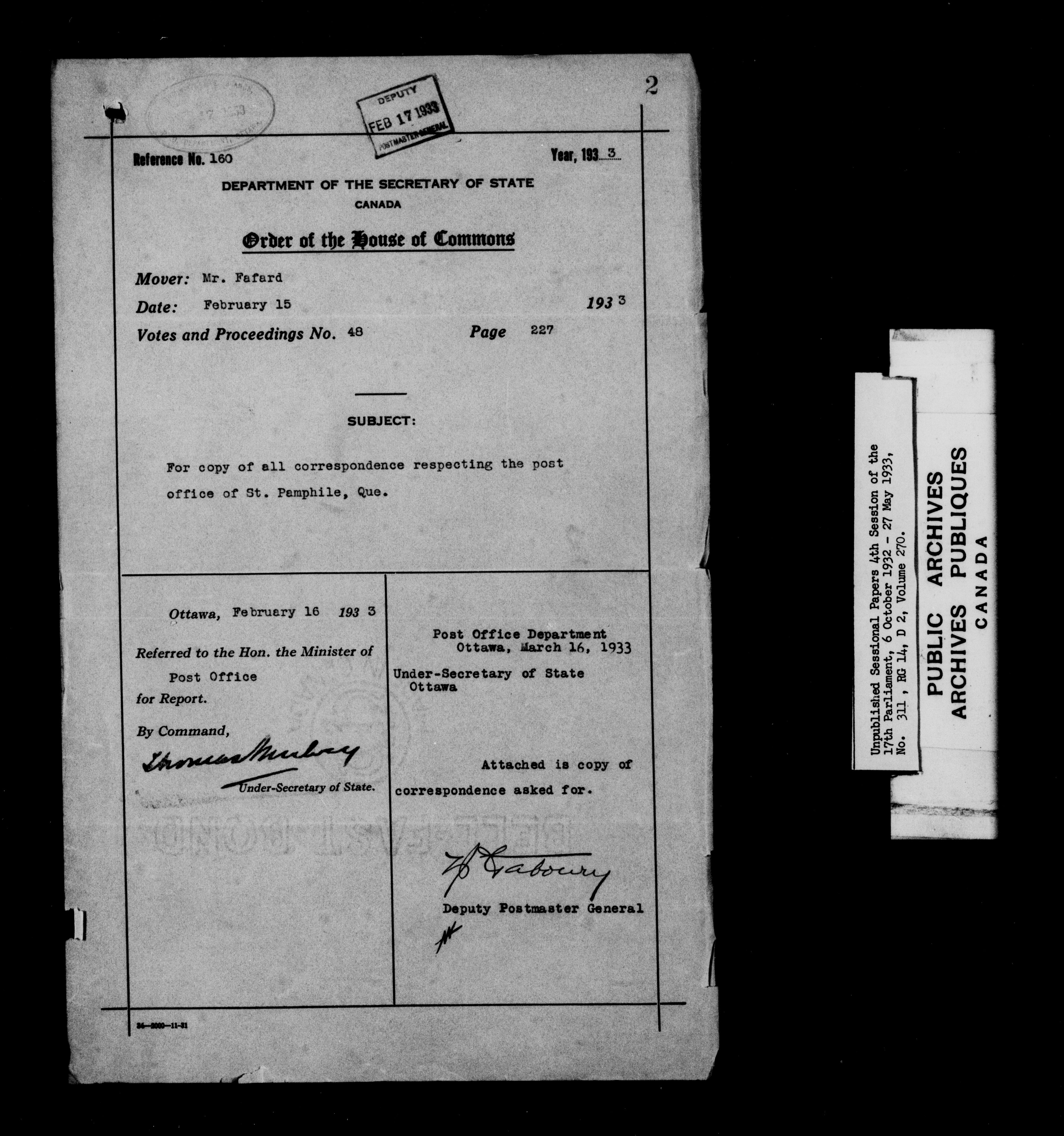 Unpublished sessional papers, 4th session of the 17th Parliament, 6 October 1932 - 27 May 1933 - 7600