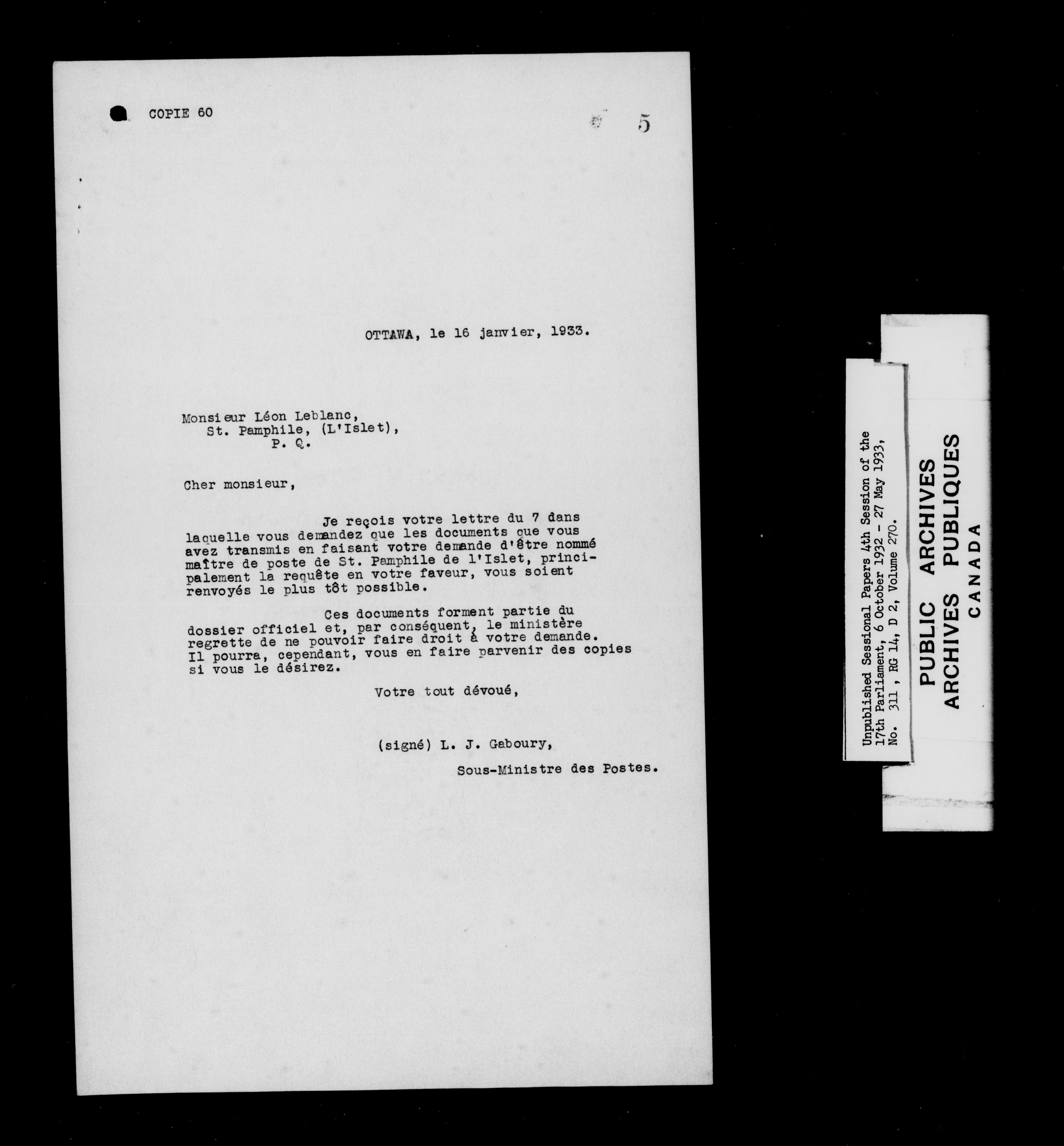 Unpublished sessional papers, 4th session of the 17th Parliament, 6 October 1932 - 27 May 1933 - 7600