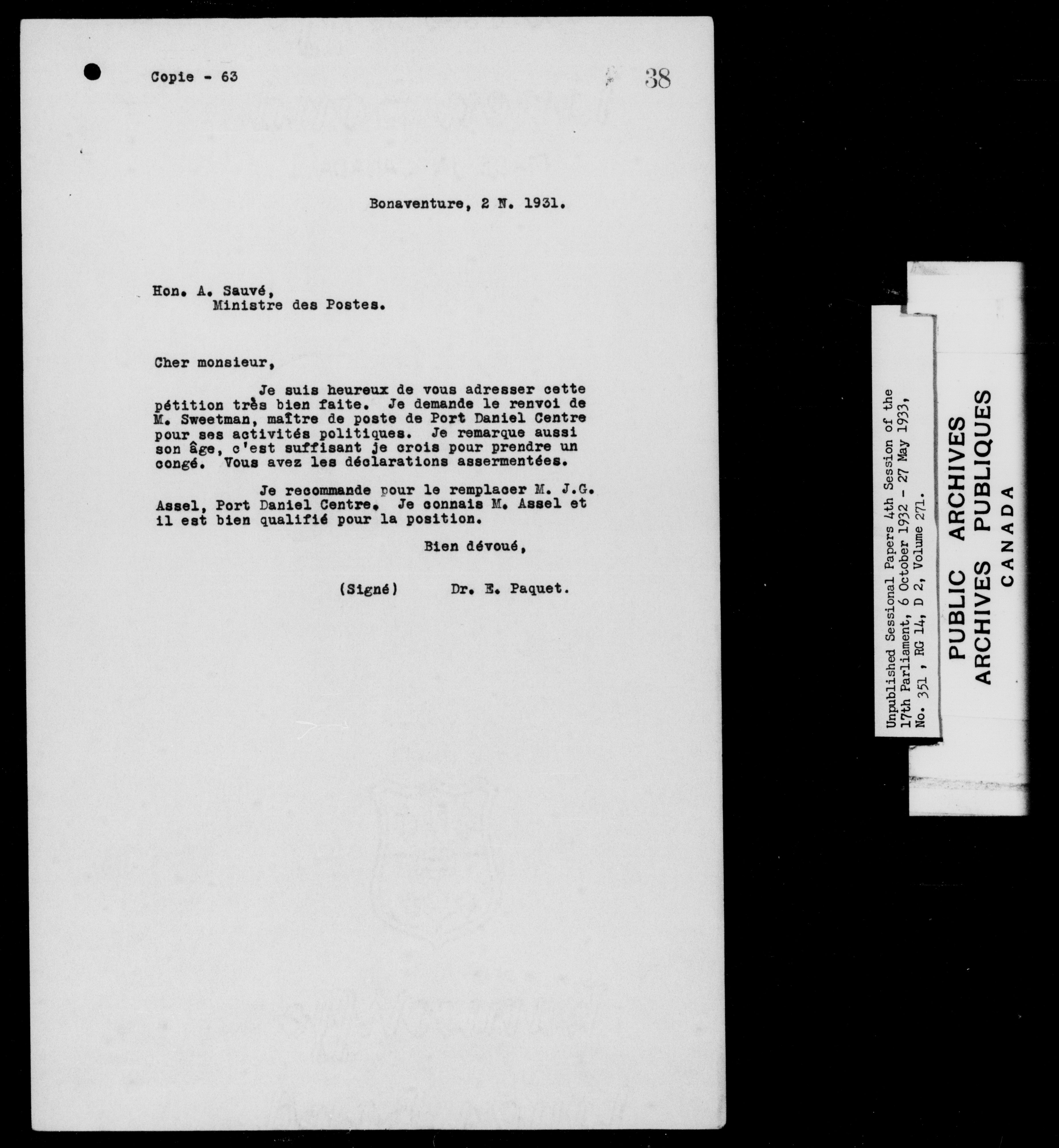 Unpublished sessional papers, 4th session of the 17th Parliament, 6 October 1932 - 27 May 1933 - 7601