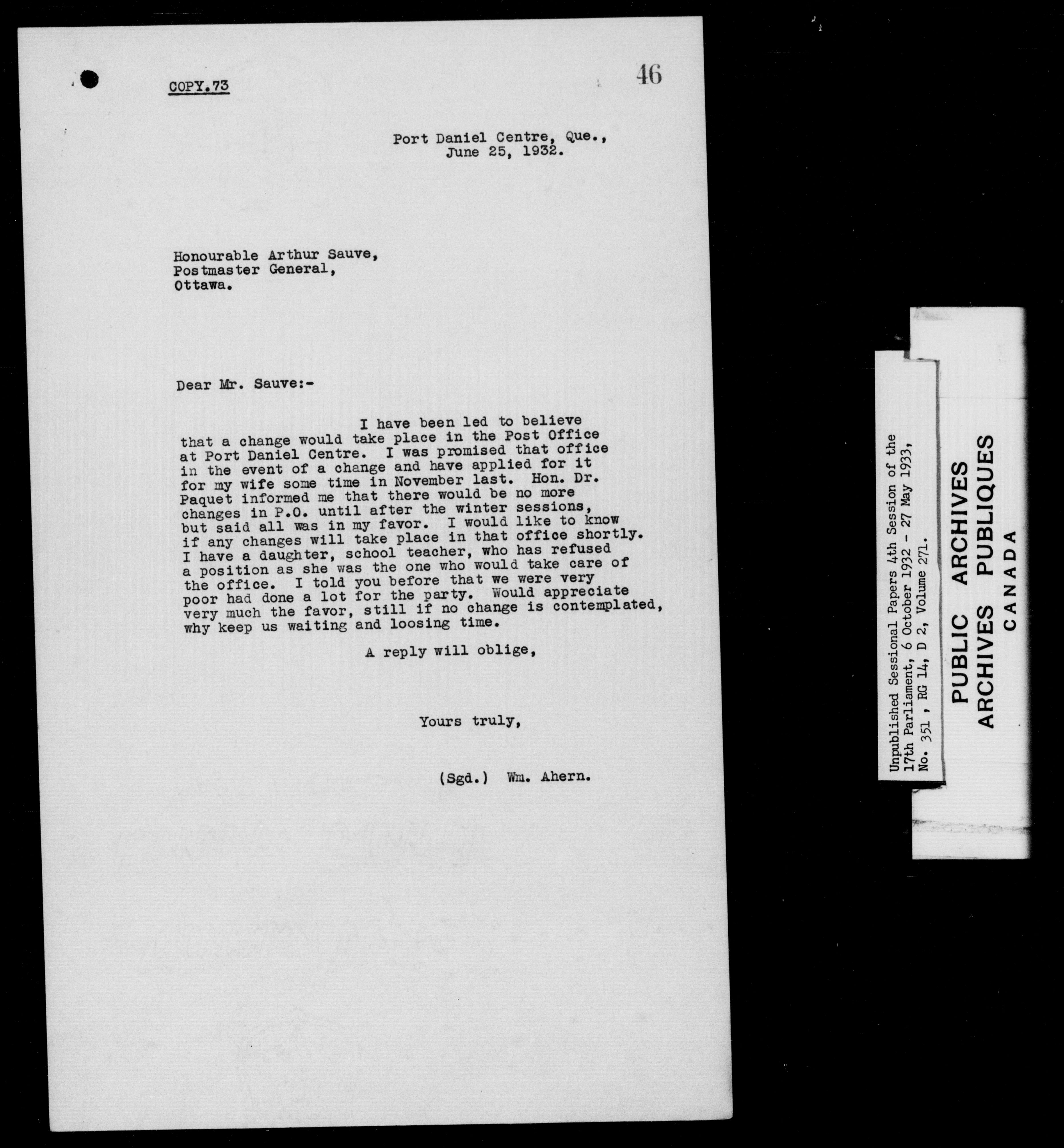 Unpublished sessional papers, 4th session of the 17th Parliament, 6 October 1932 - 27 May 1933 - 7601
