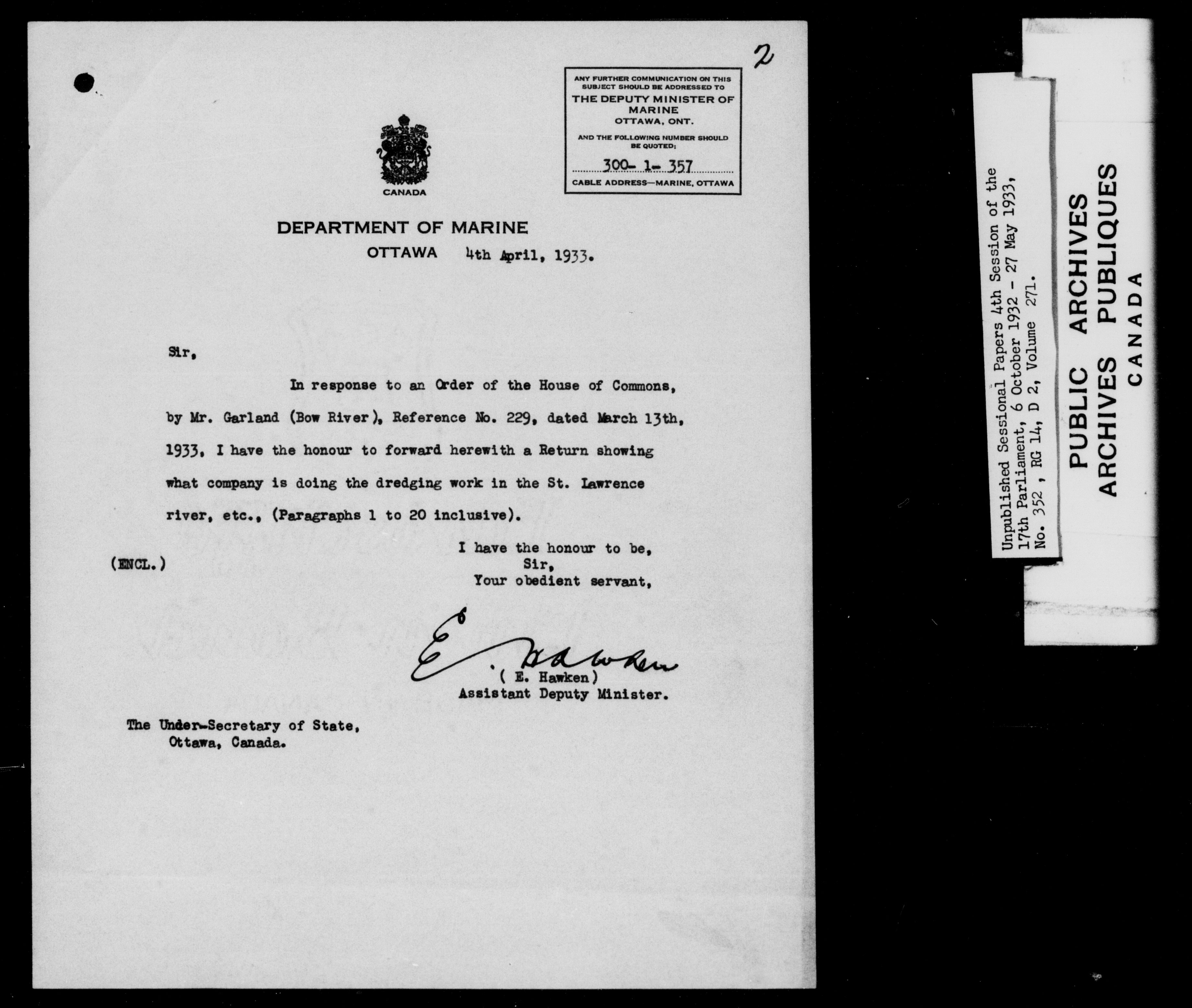 Unpublished sessional papers, 4th session of the 17th Parliament, 6 October 1932 - 27 May 1933 - 7601