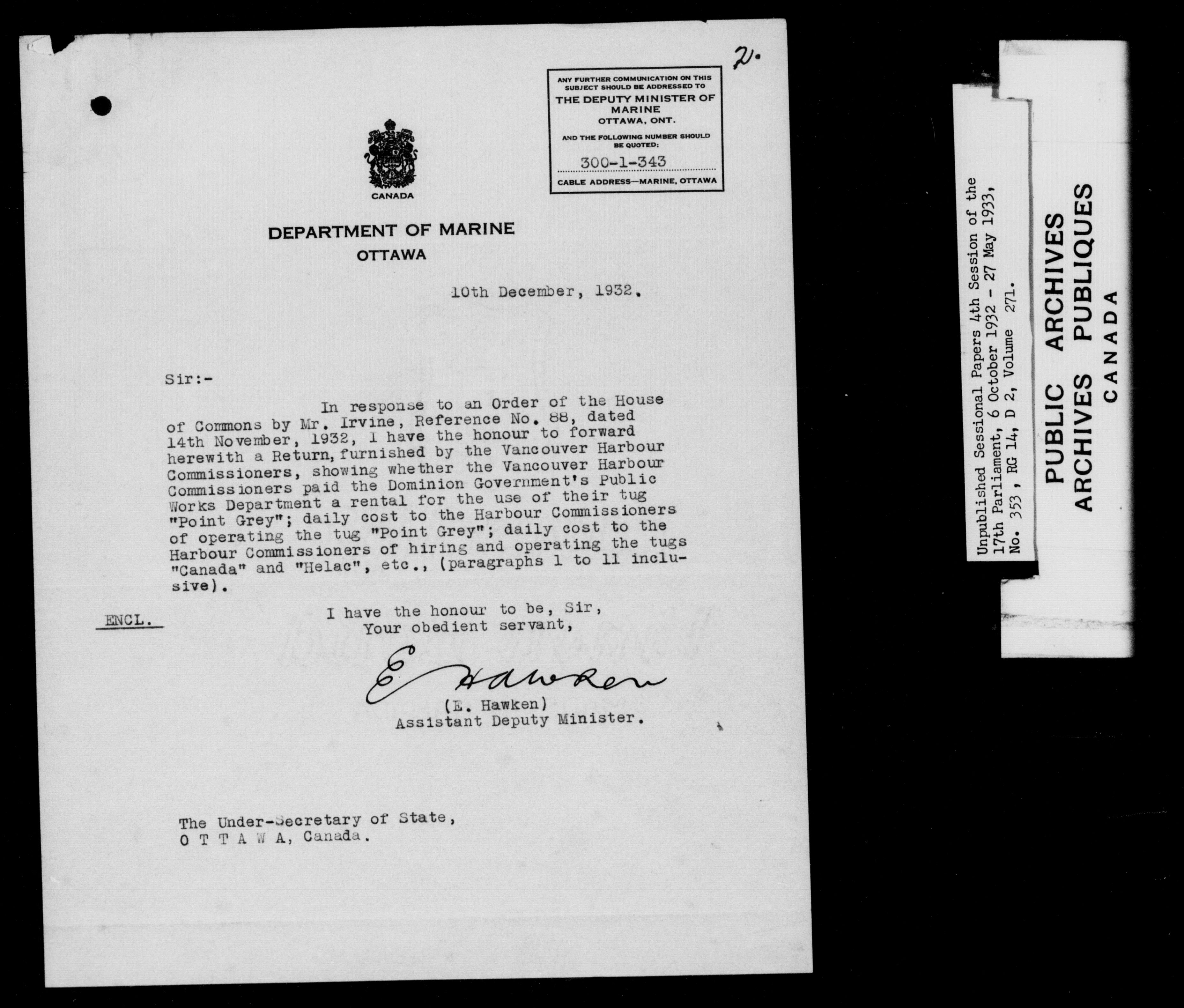 Unpublished sessional papers, 4th session of the 17th Parliament, 6 October 1932 - 27 May 1933 - 7601