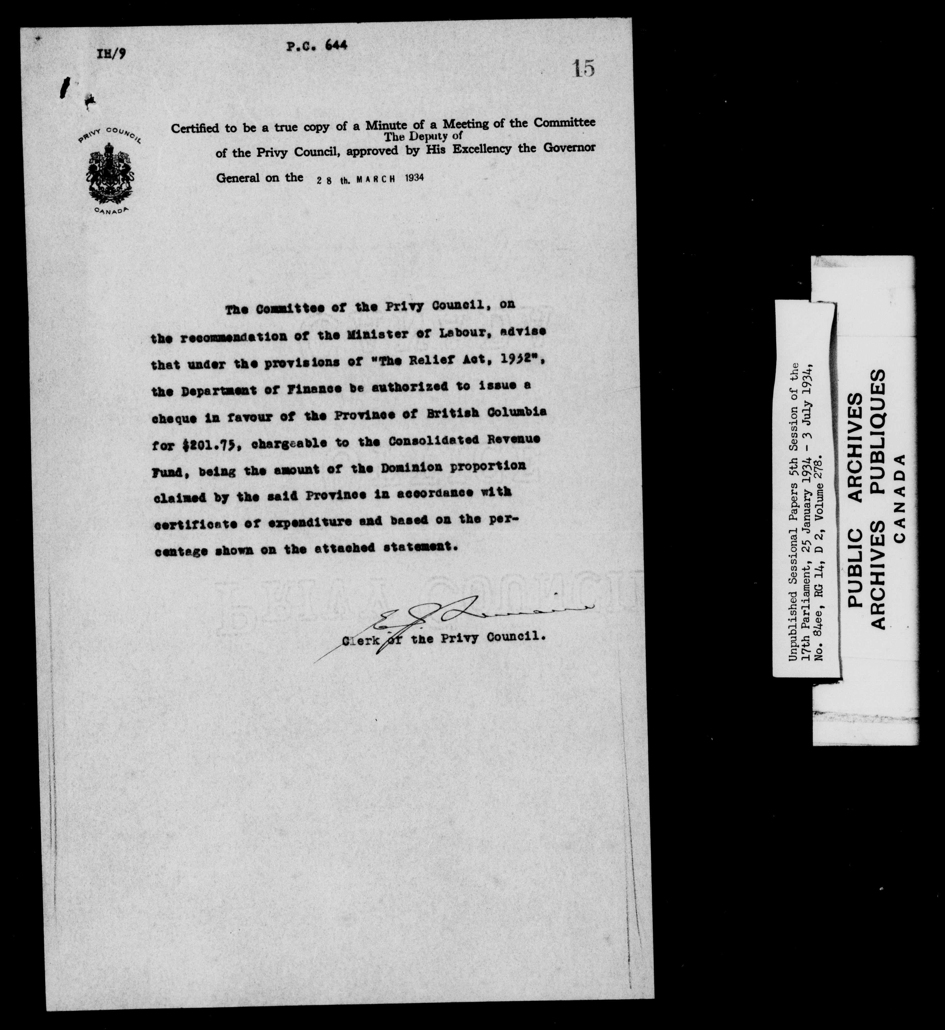 Unpublished sessional papers, 5th session of the 17th Parliament, 25 January - 3 July 1934 - 7604