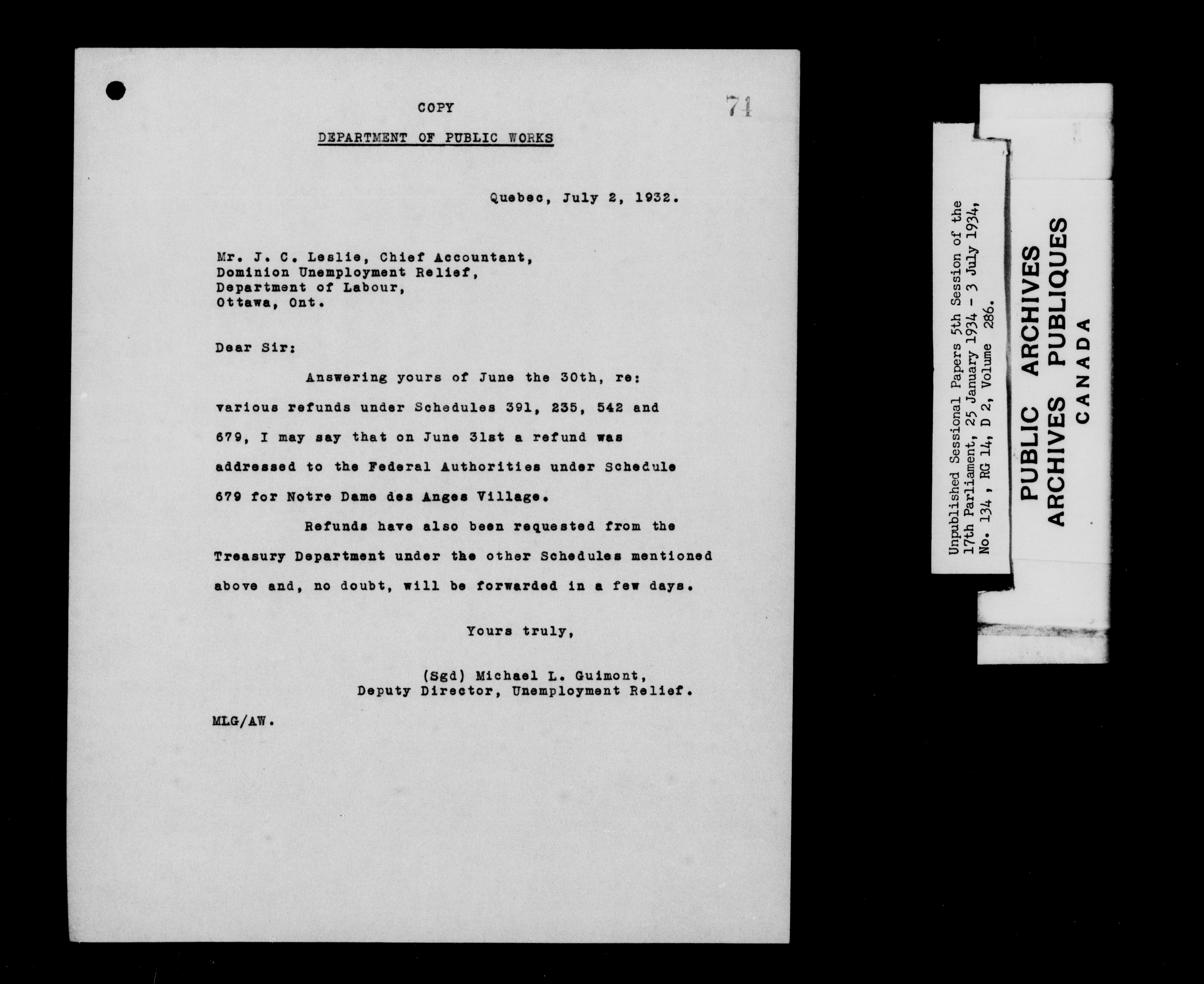 Unpublished sessional papers, 5th session of the 17th Parliament, 25 January - 3 July 1934 - 7610
