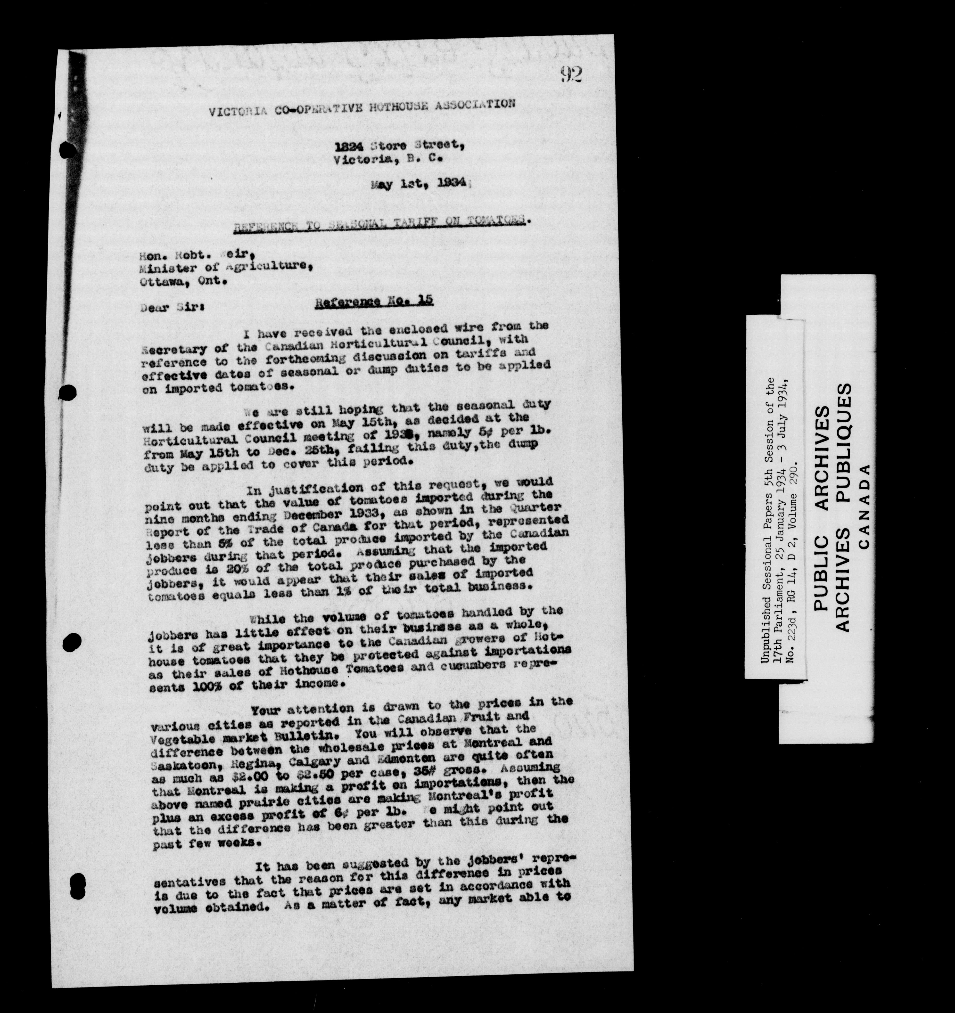 Unpublished sessional papers, 5th session of the 17th Parliament, 25 January - 3 July 1934 - 7612
