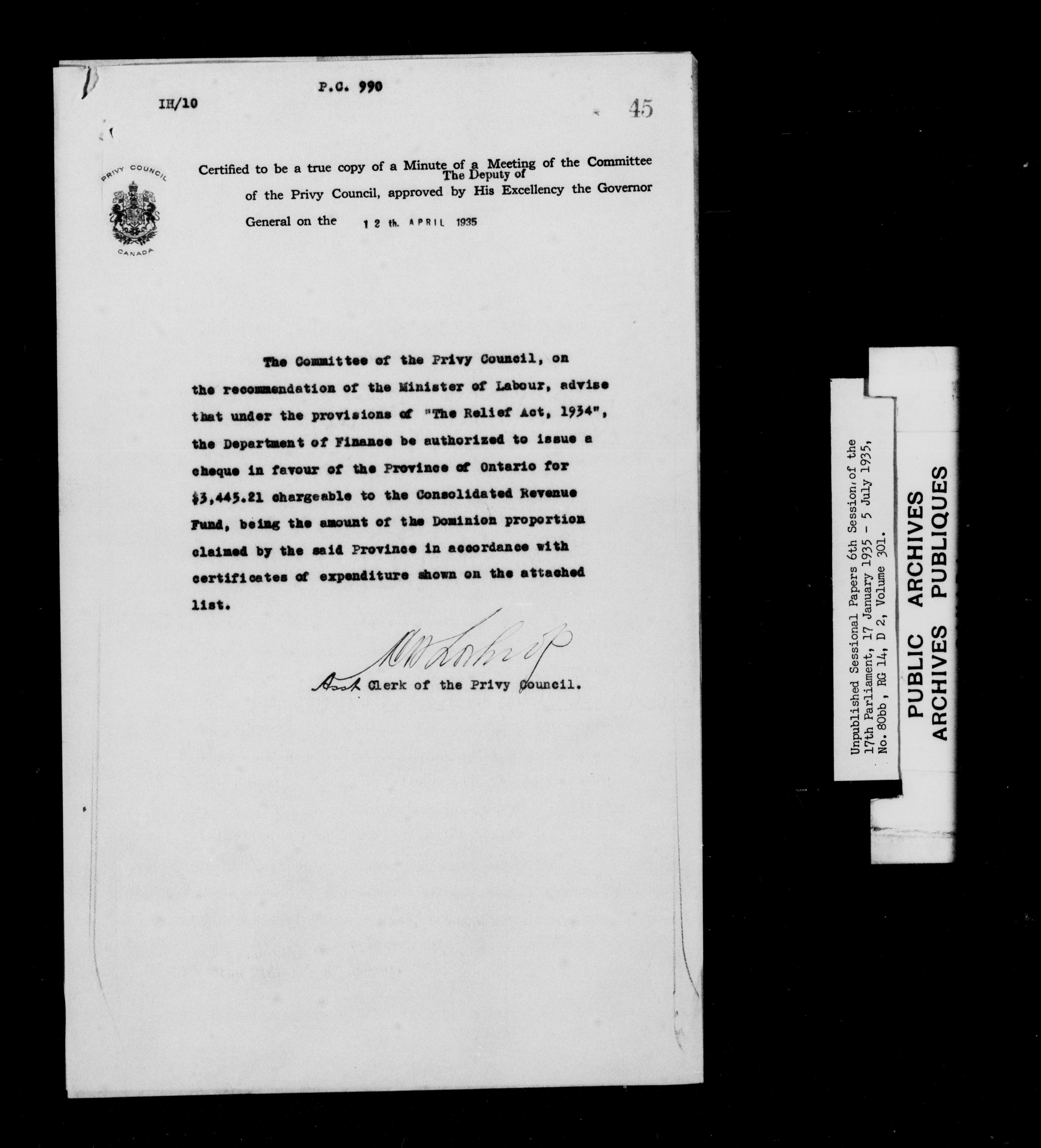 Unpublished sessional papers, 6th session of the 17th Parliament, 17th January - 5 July 1935 - 7618