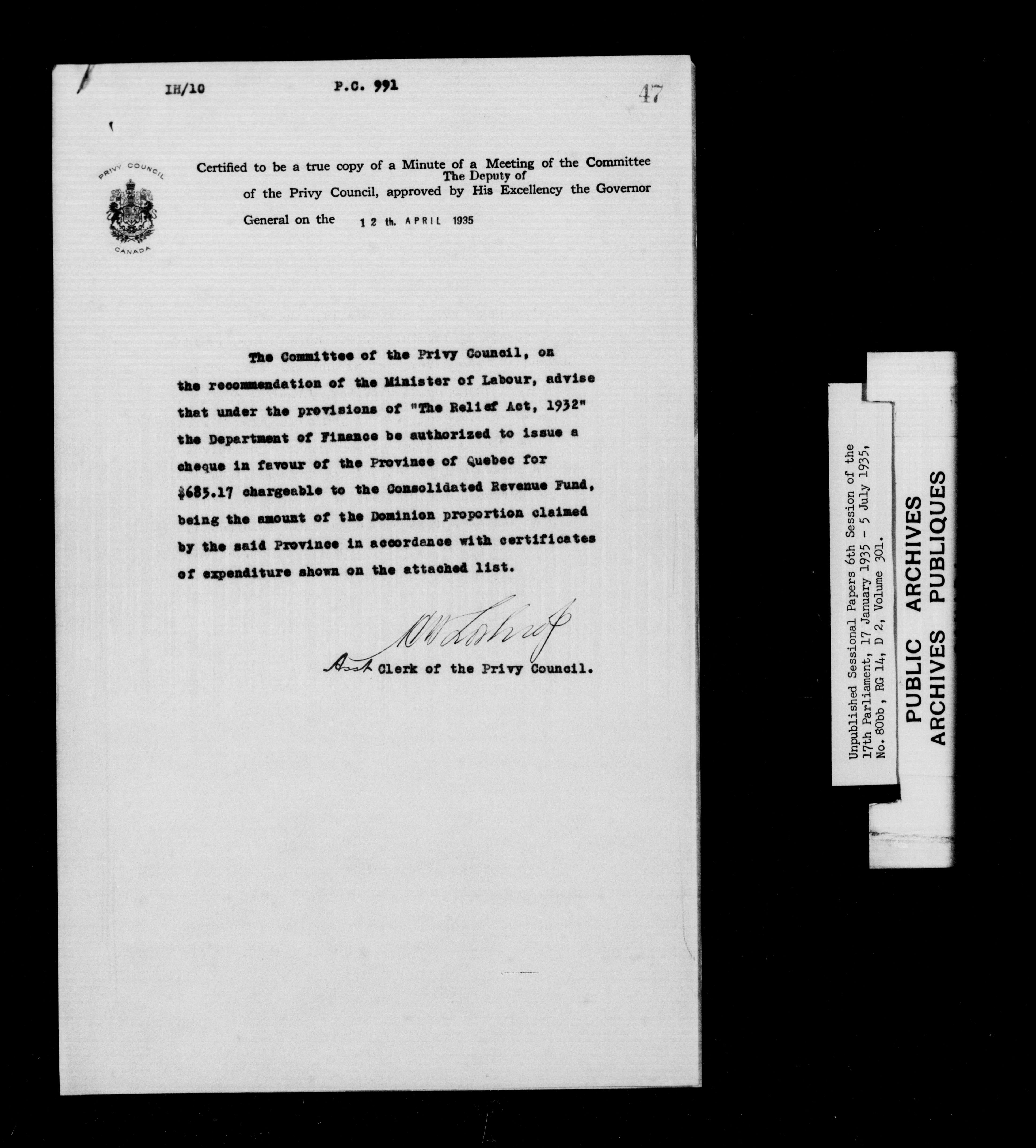 Unpublished sessional papers, 6th session of the 17th Parliament, 17th January - 5 July 1935 - 7618
