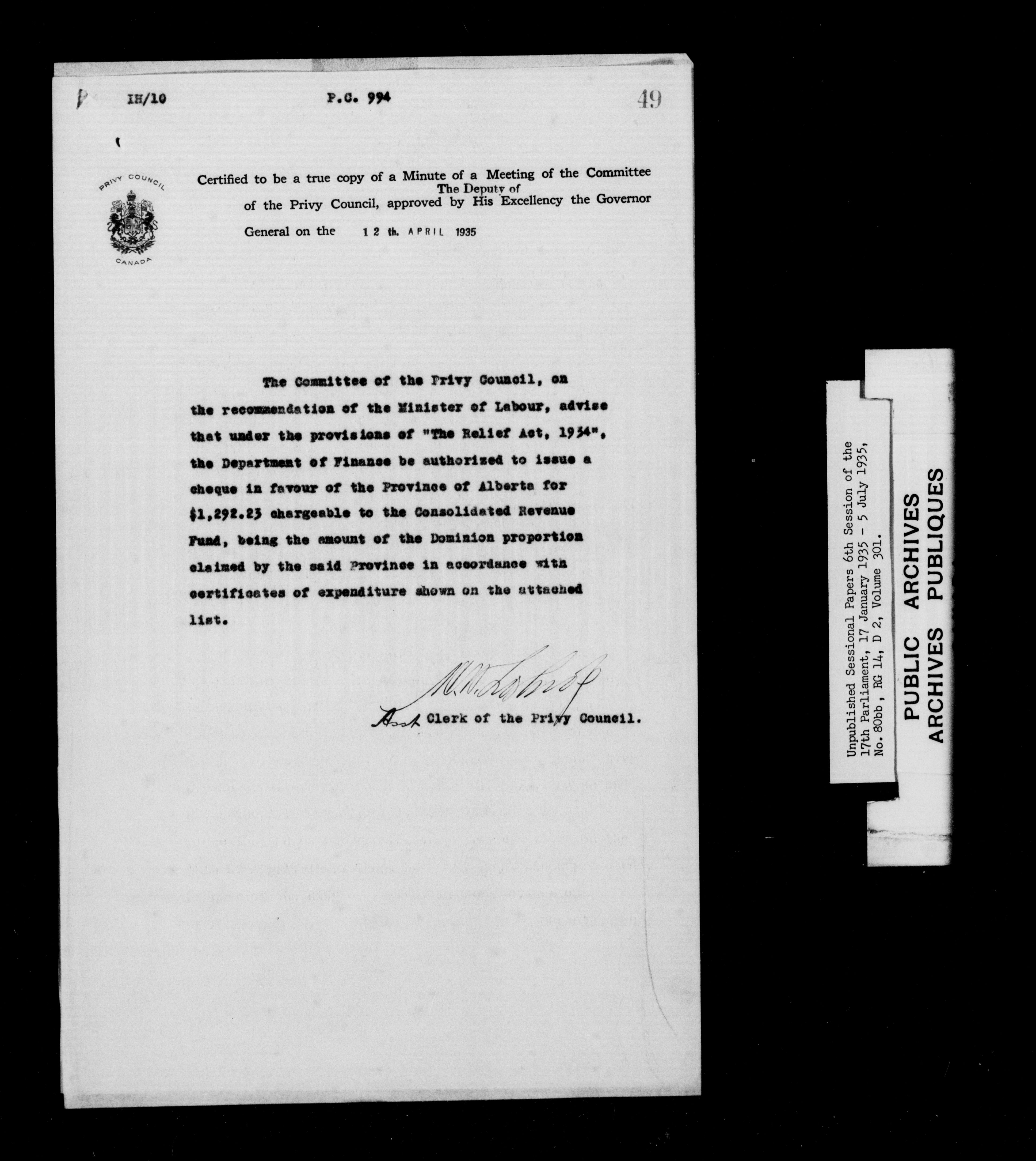 Unpublished sessional papers, 6th session of the 17th Parliament, 17th January - 5 July 1935 - 7618