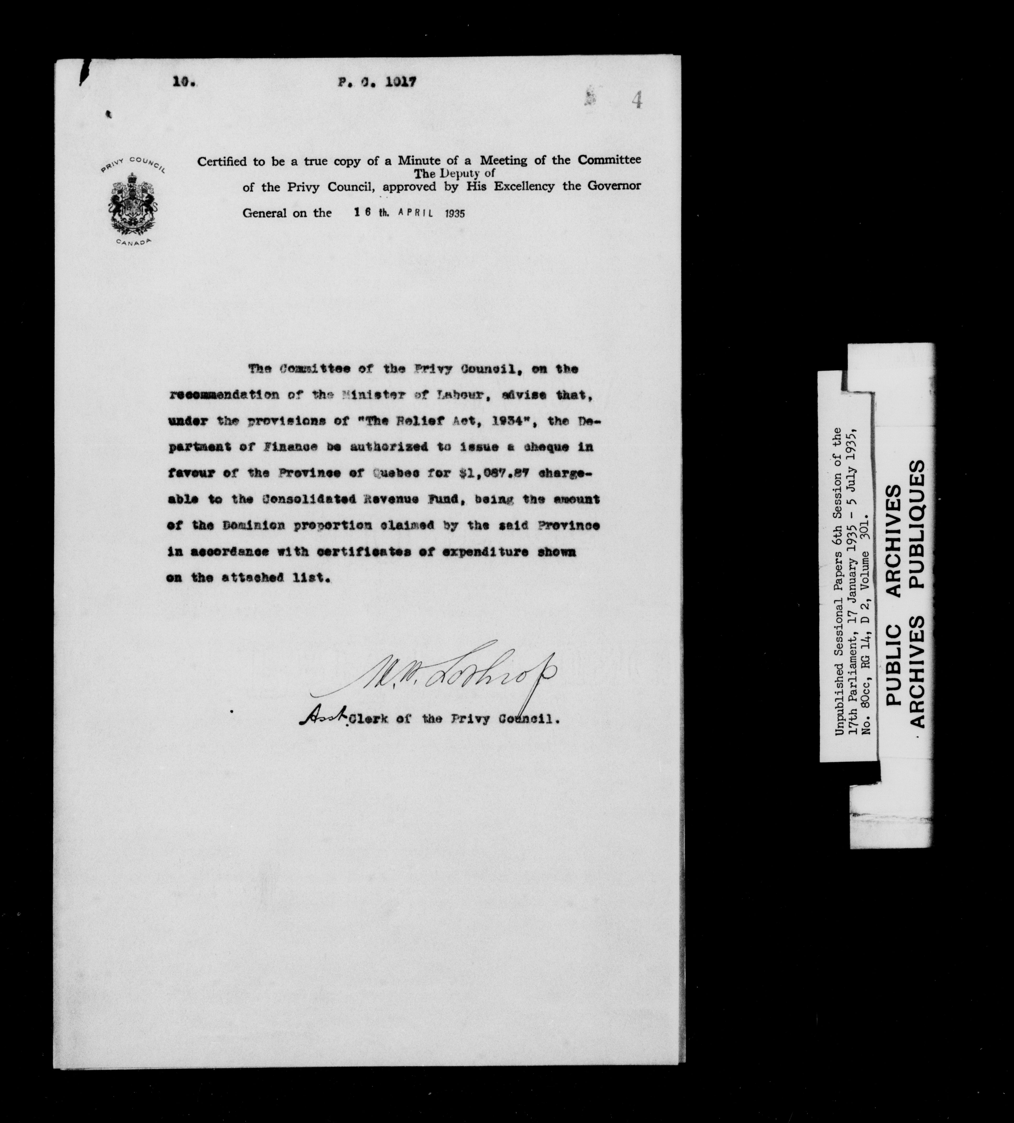 Unpublished sessional papers, 6th session of the 17th Parliament, 17th January - 5 July 1935 - 7618