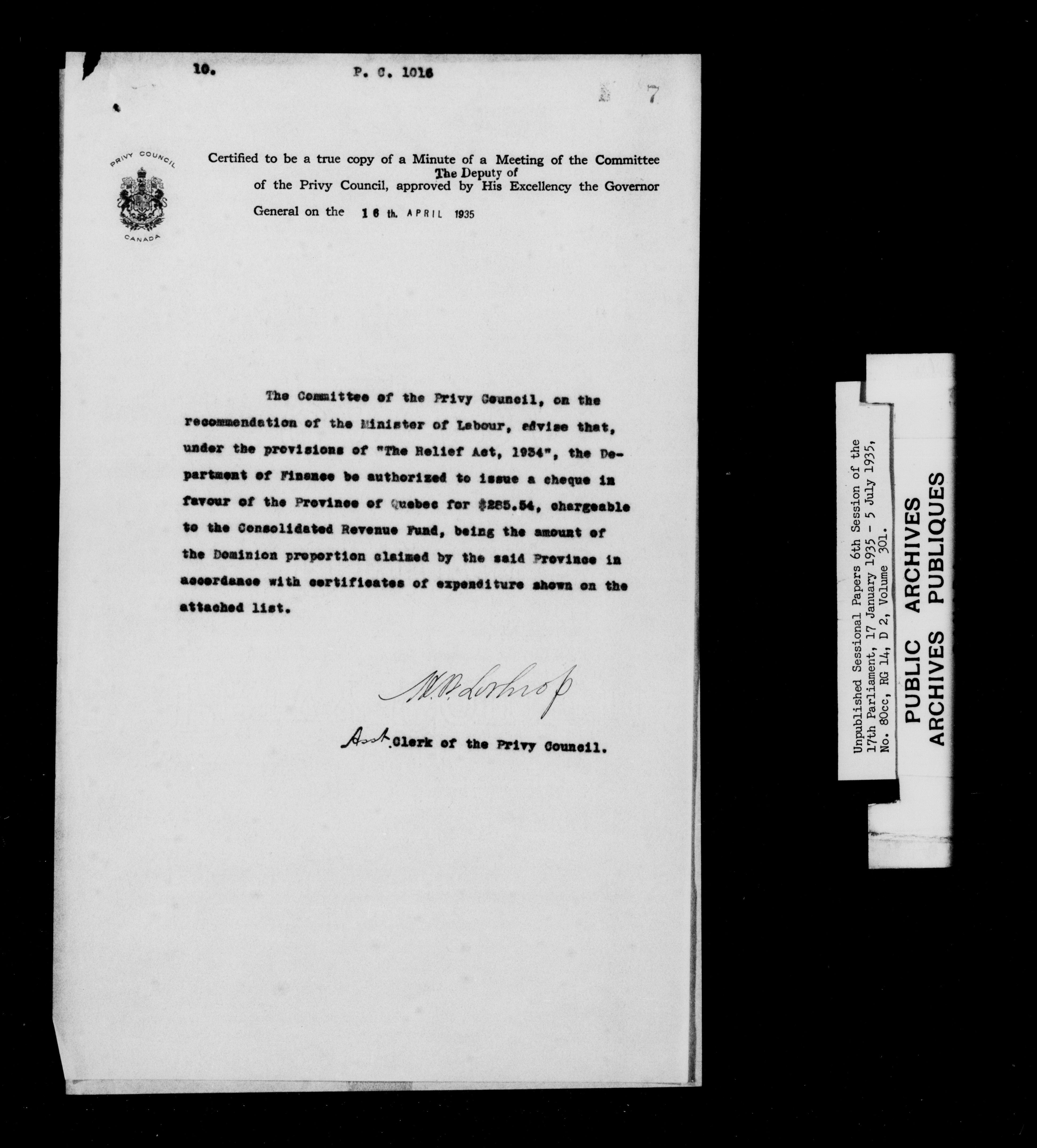 Unpublished sessional papers, 6th session of the 17th Parliament, 17th January - 5 July 1935 - 7618