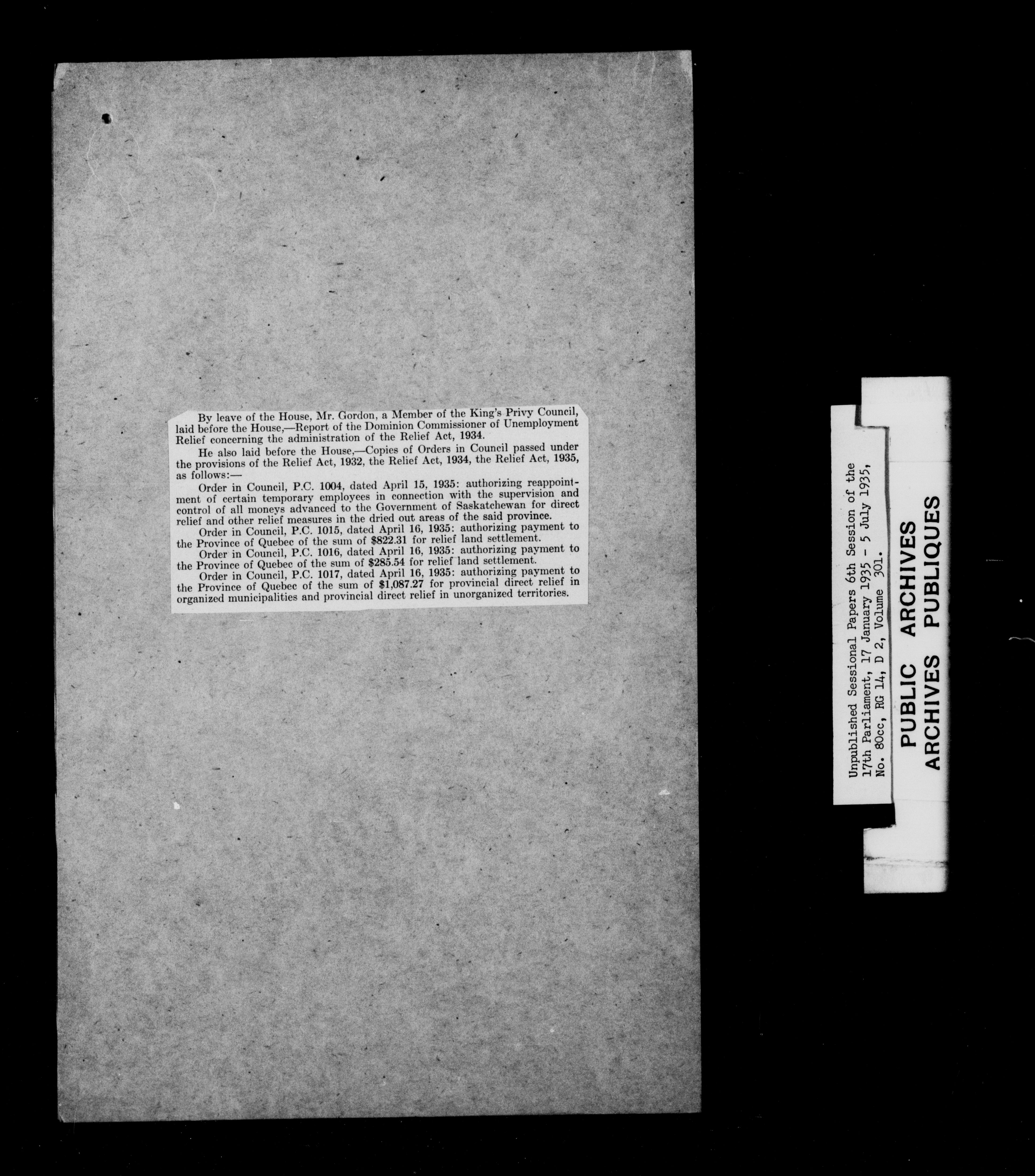 Unpublished sessional papers, 6th session of the 17th Parliament, 17th January - 5 July 1935 - 7618