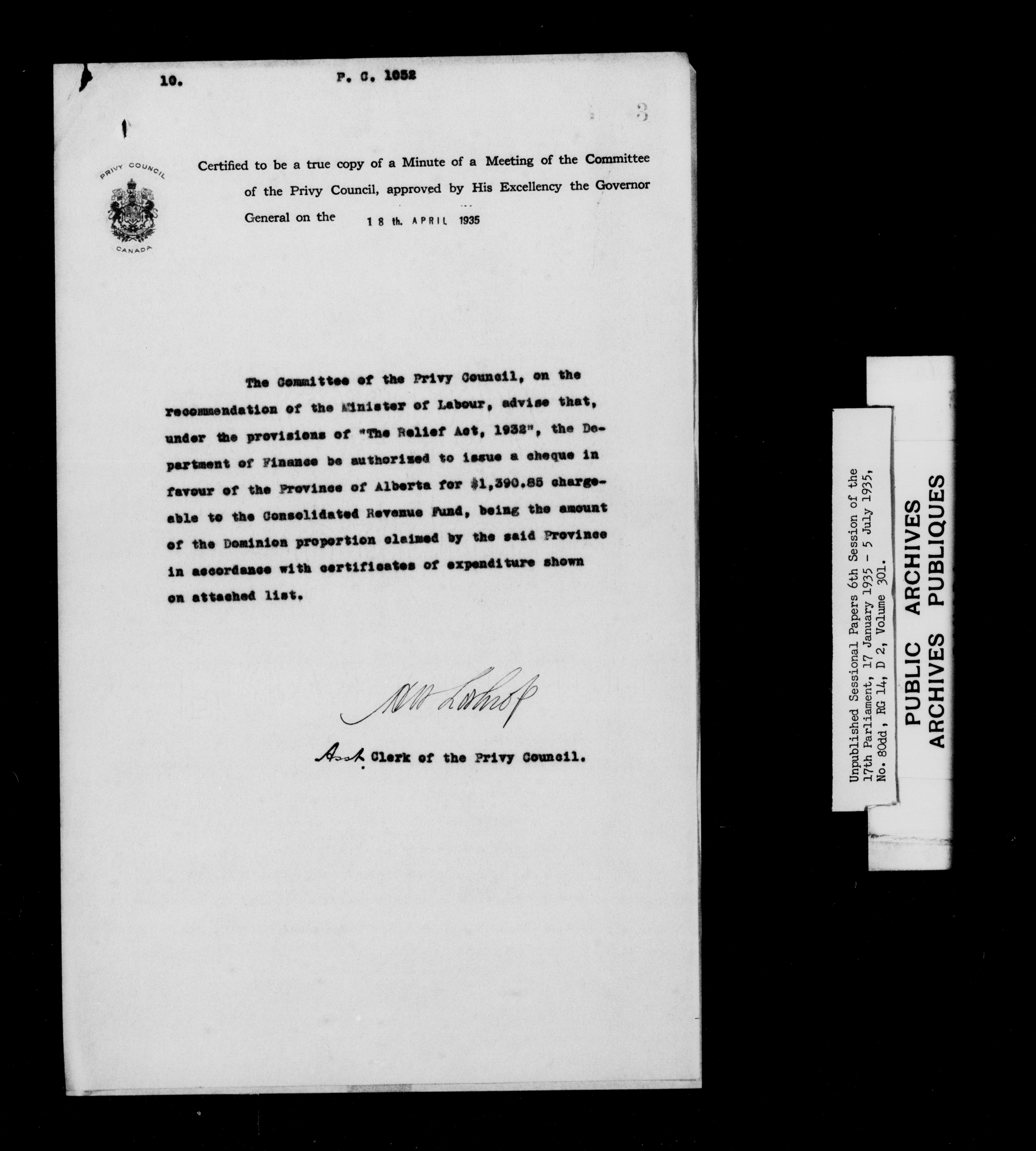 Unpublished sessional papers, 6th session of the 17th Parliament, 17th January - 5 July 1935 - 7618