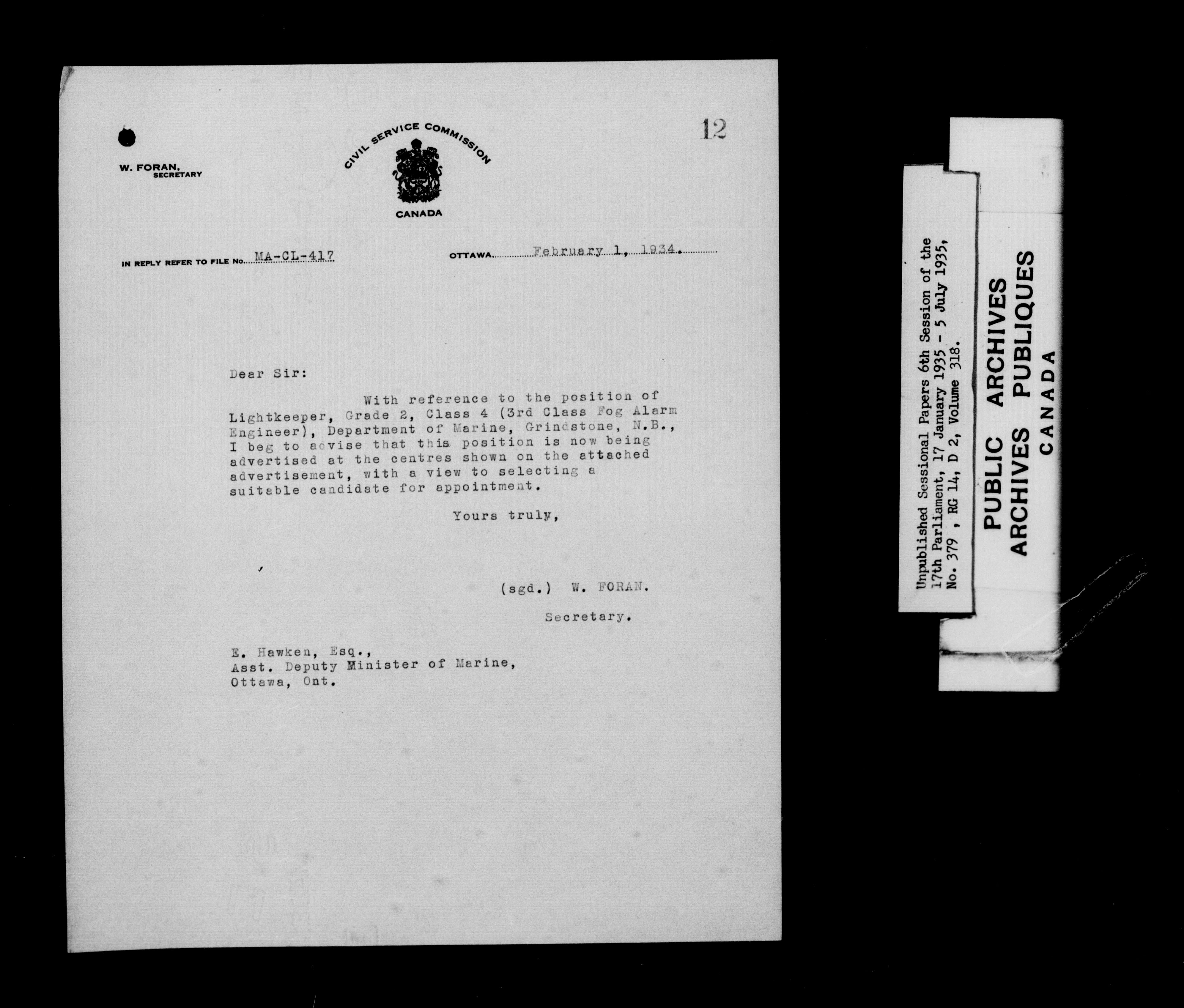 Unpublished sessional papers, 6th session of the 17th Parliament, 17th January - 5 July 1935 - 7630