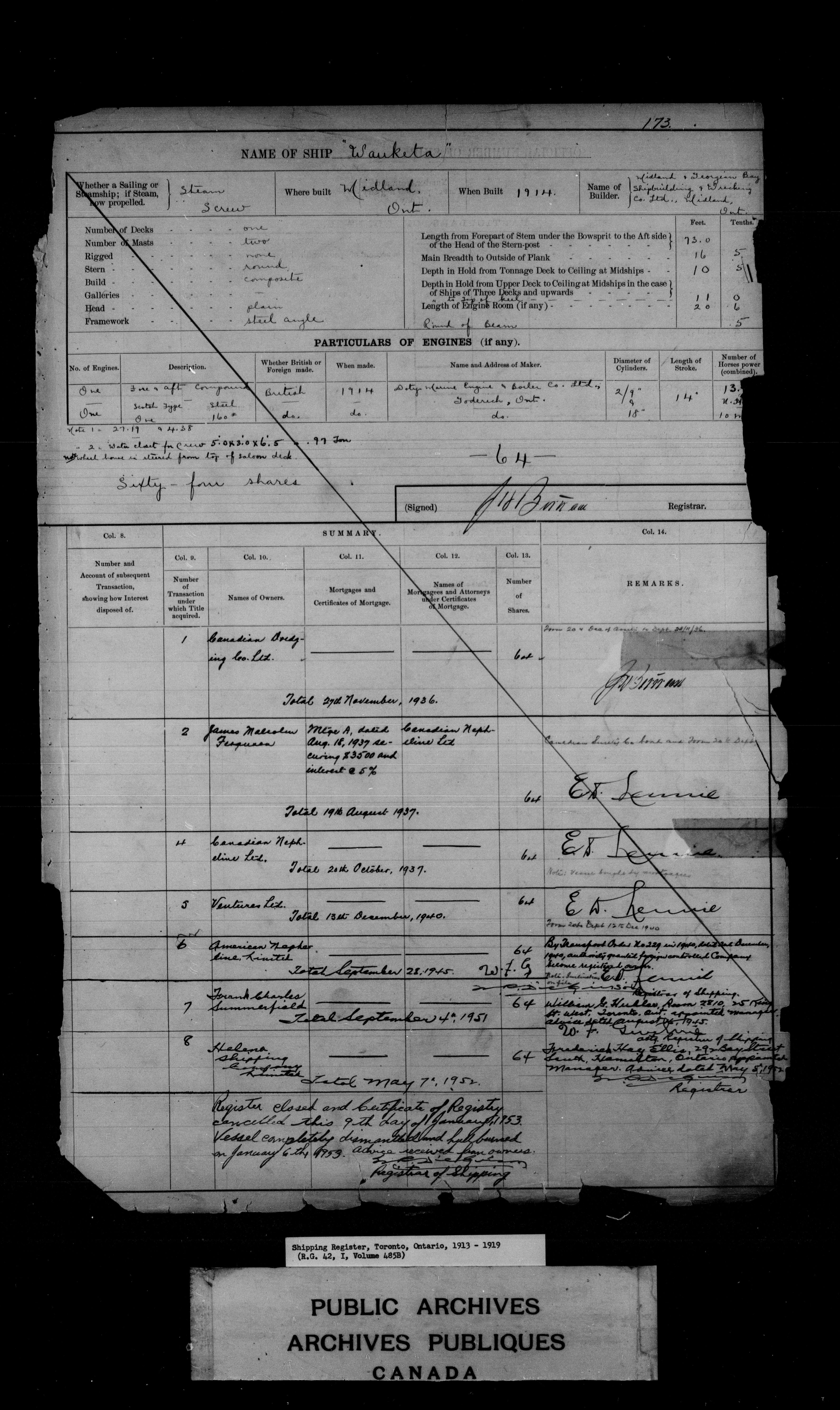 Toronto [Ontario] Registrar of Shipping, 1874-1958 : C-7635