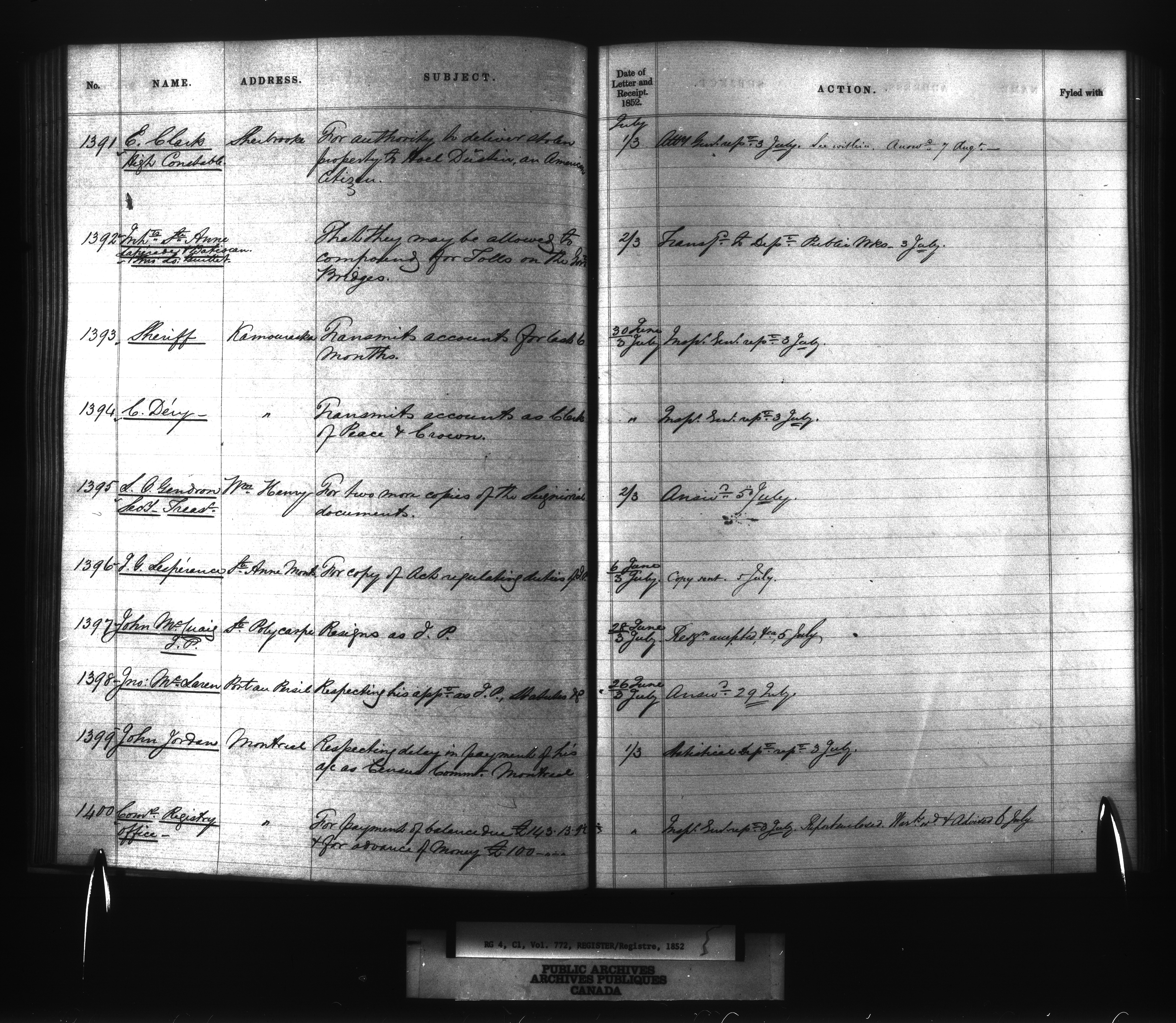 Provincial Secretary numbered correspondence files, Canada East : Registers and Indexes, 1839-1867 - 7738