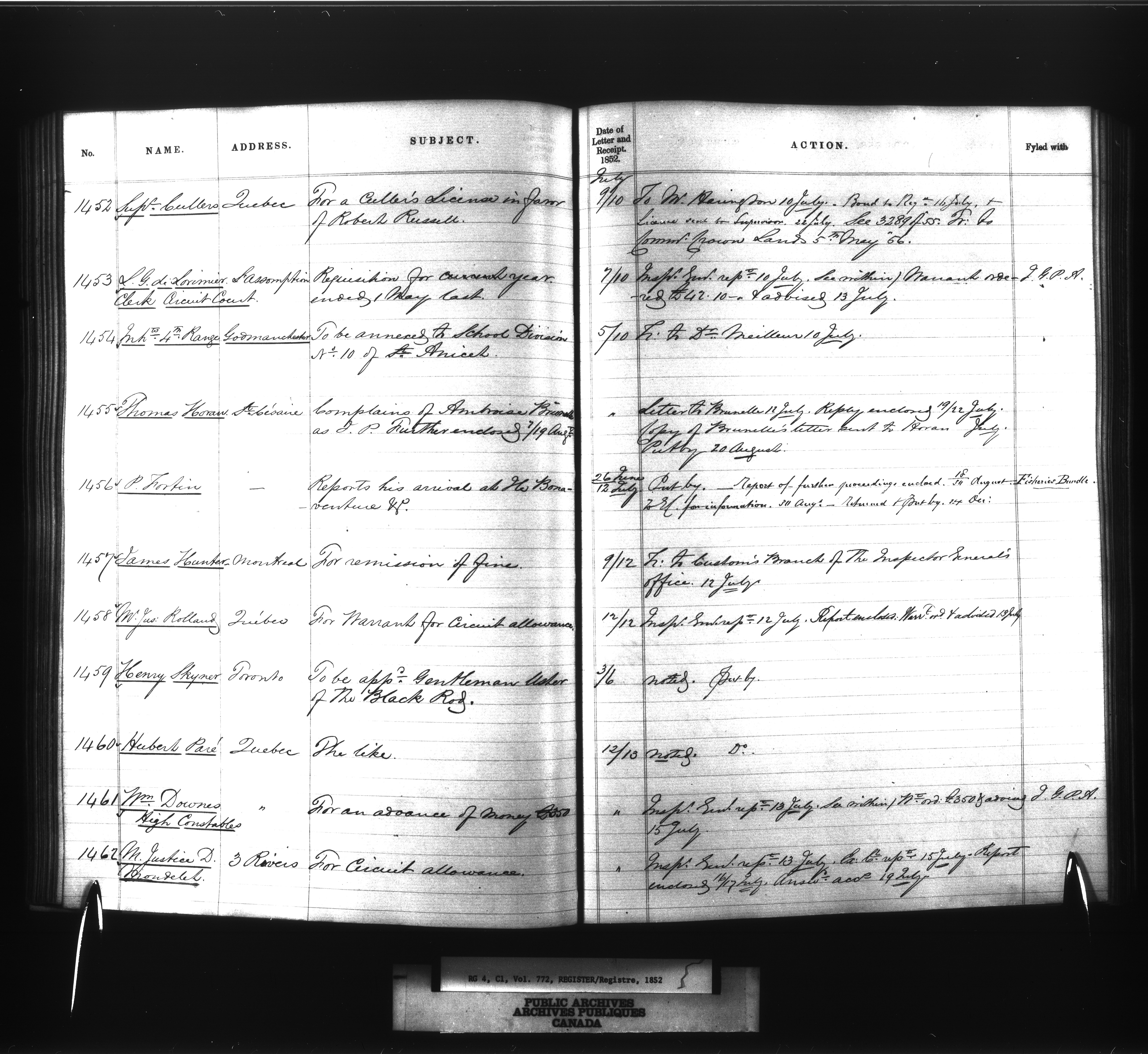 Provincial Secretary numbered correspondence files, Canada East : Registers and Indexes, 1839-1867 - 7738