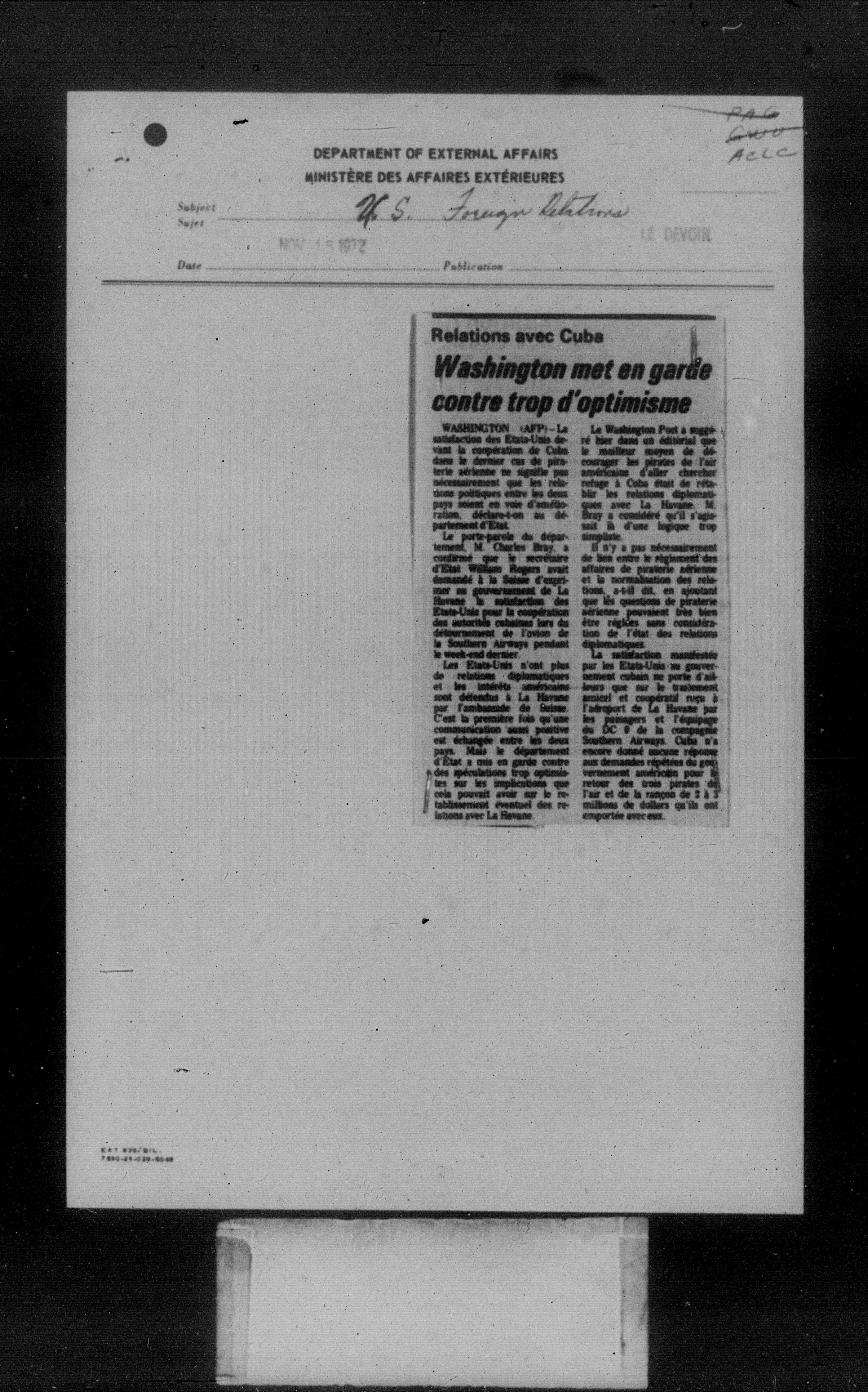 Department of External Affairs Library : newspaper clippings and manuals - 7765