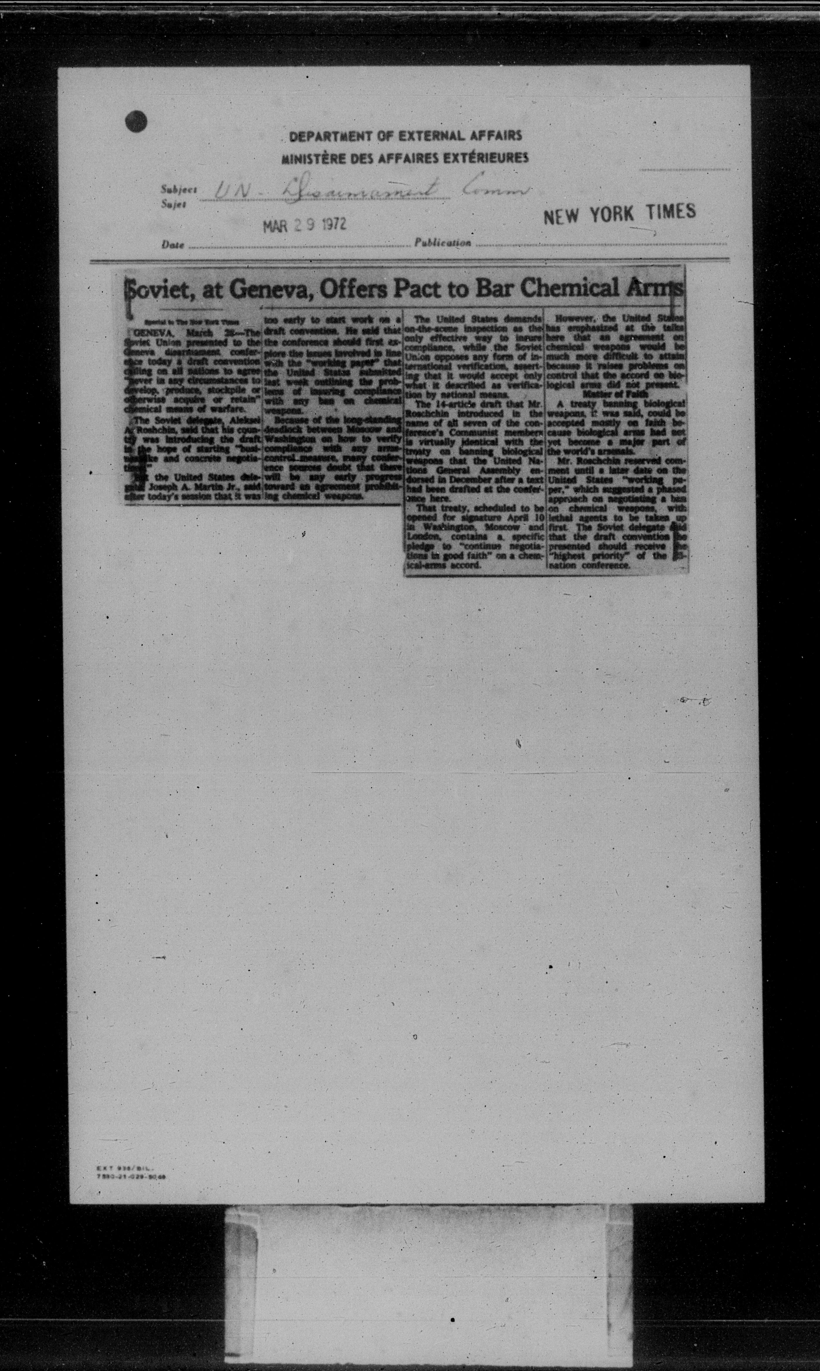 Department of External Affairs Library : newspaper clippings and manuals - 7765