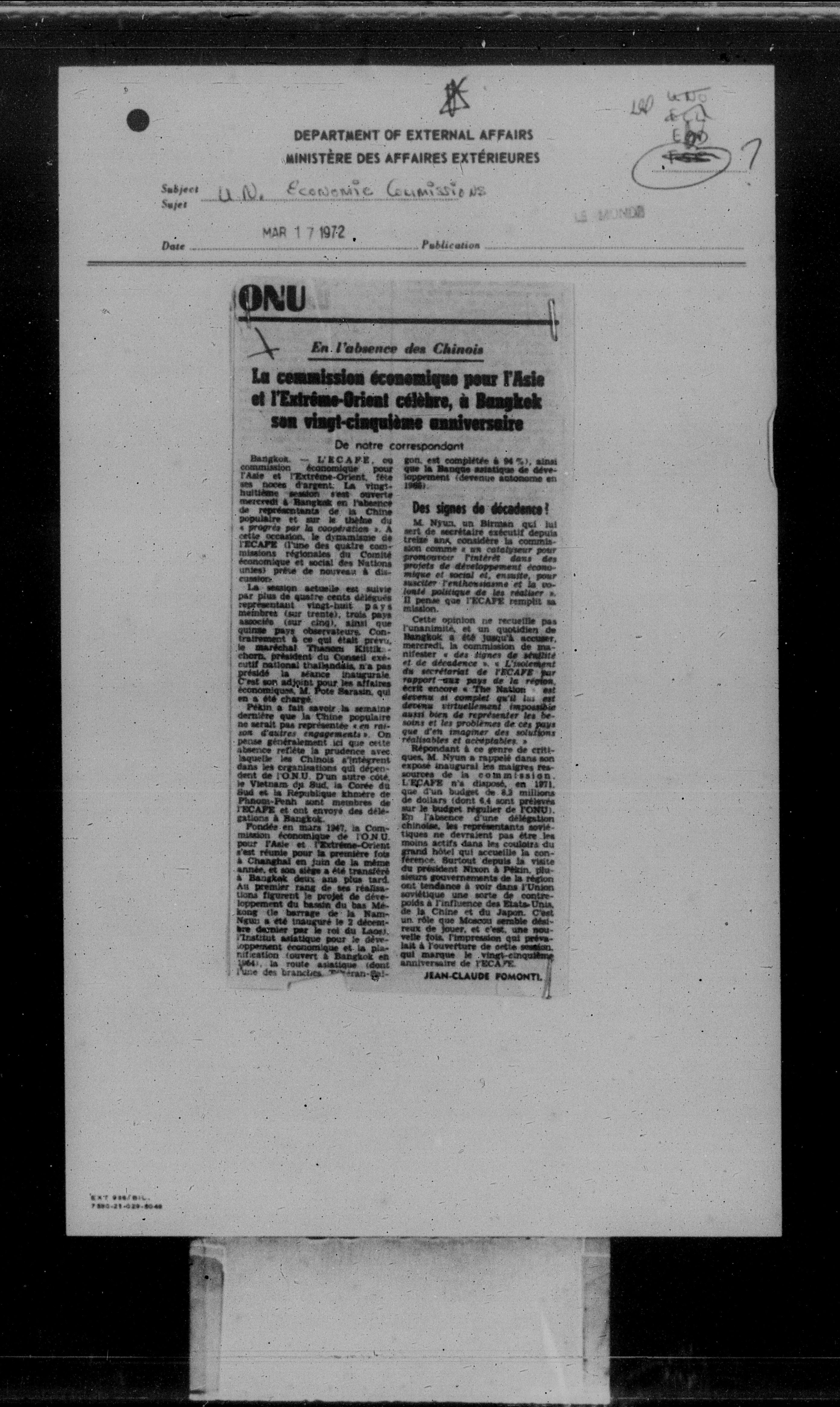 Department of External Affairs Library : newspaper clippings and manuals - 7765