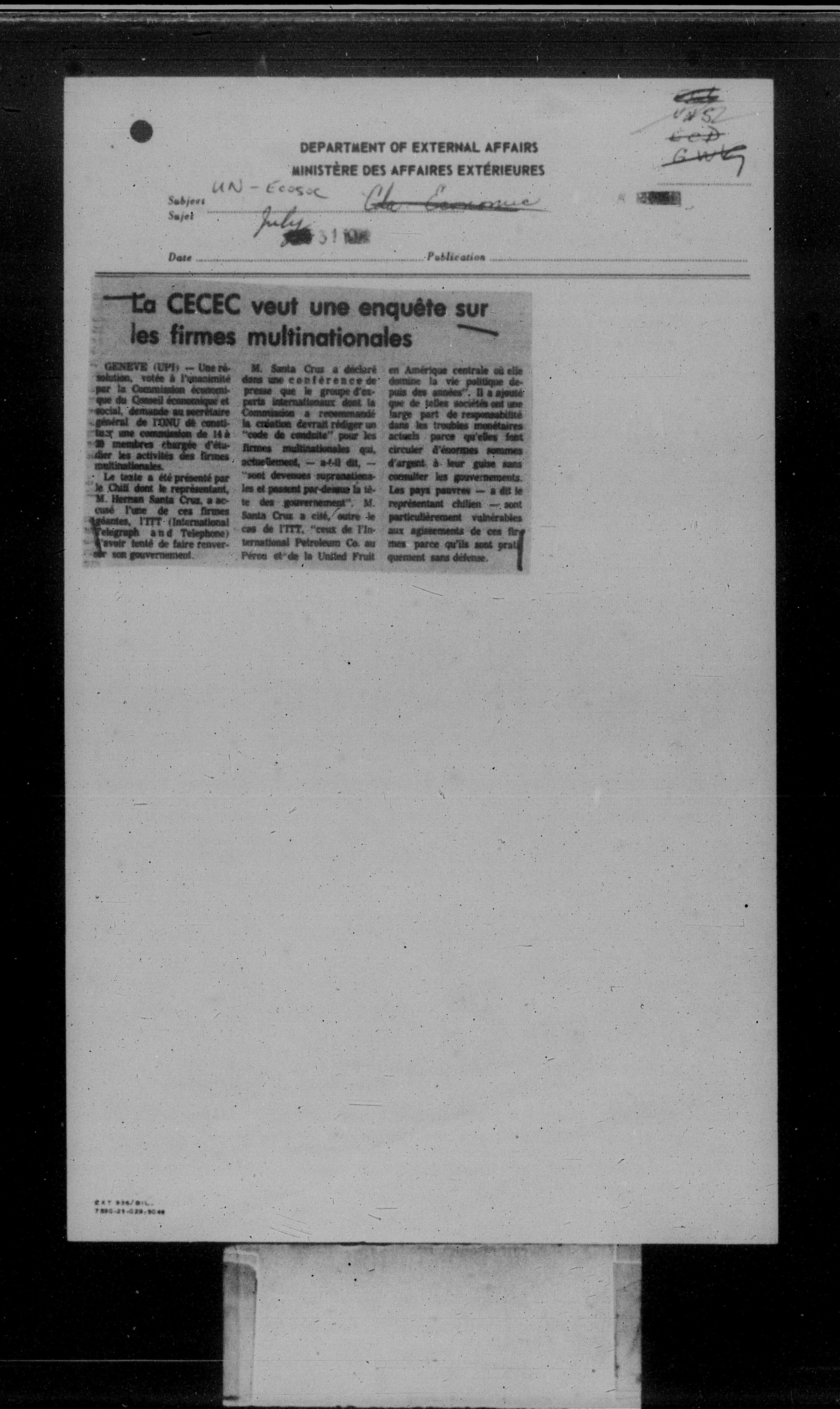 Department of External Affairs Library : newspaper clippings and manuals - 7765