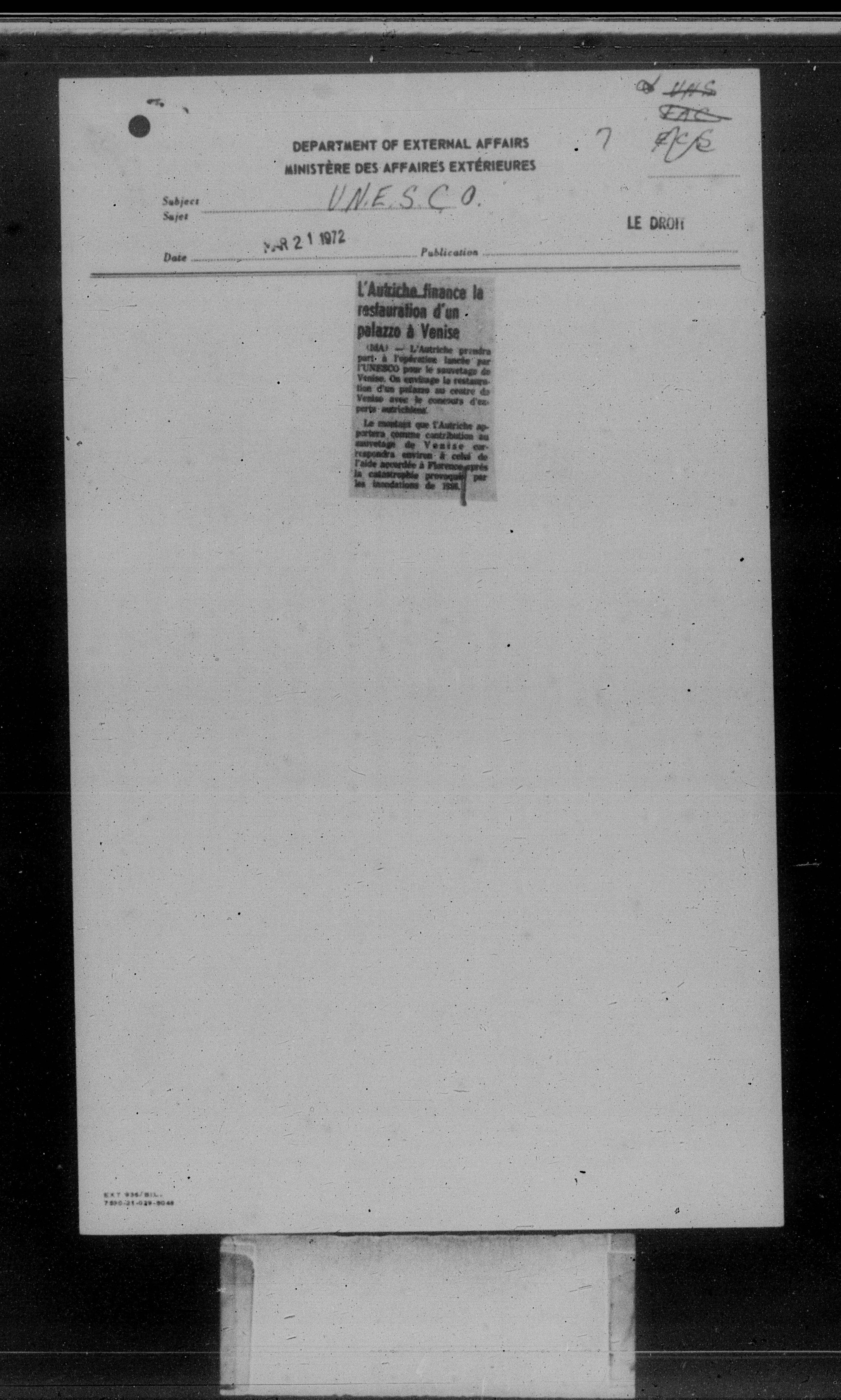 Department of External Affairs Library : newspaper clippings and manuals - 7765