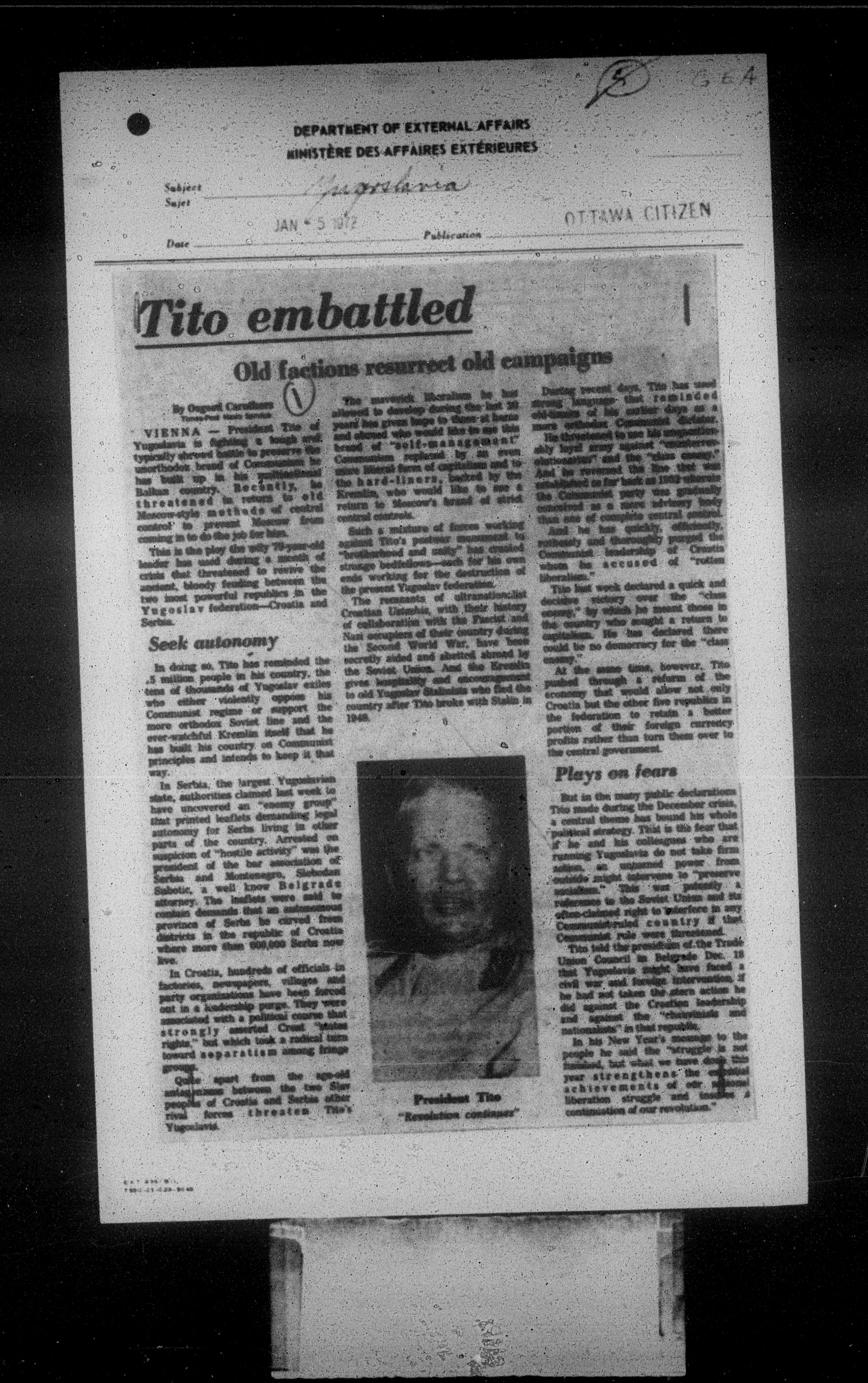 Department of External Affairs Library : newspaper clippings and manuals : C-7767