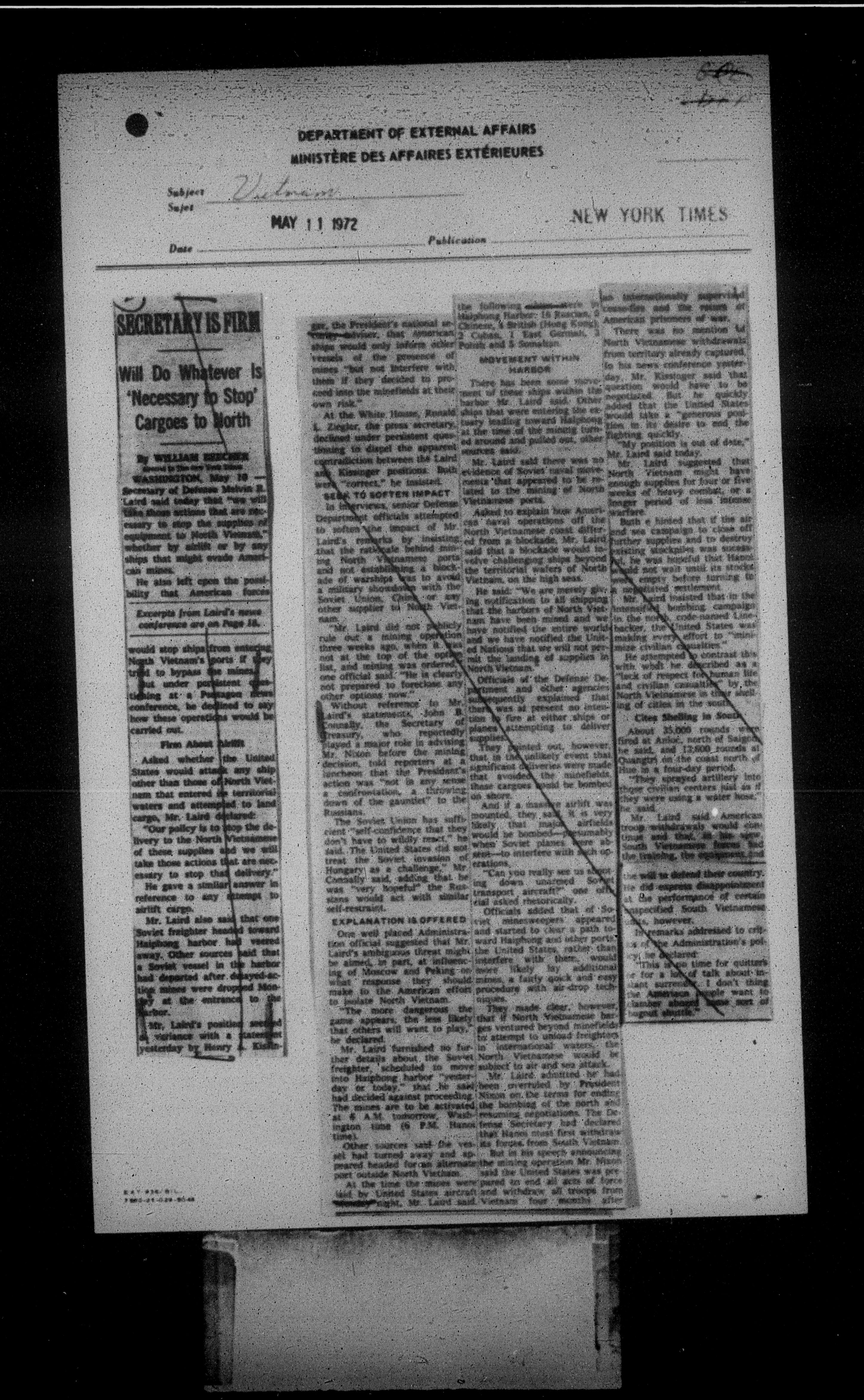 Department of External Affairs Library : newspaper clippings and manuals - 7767