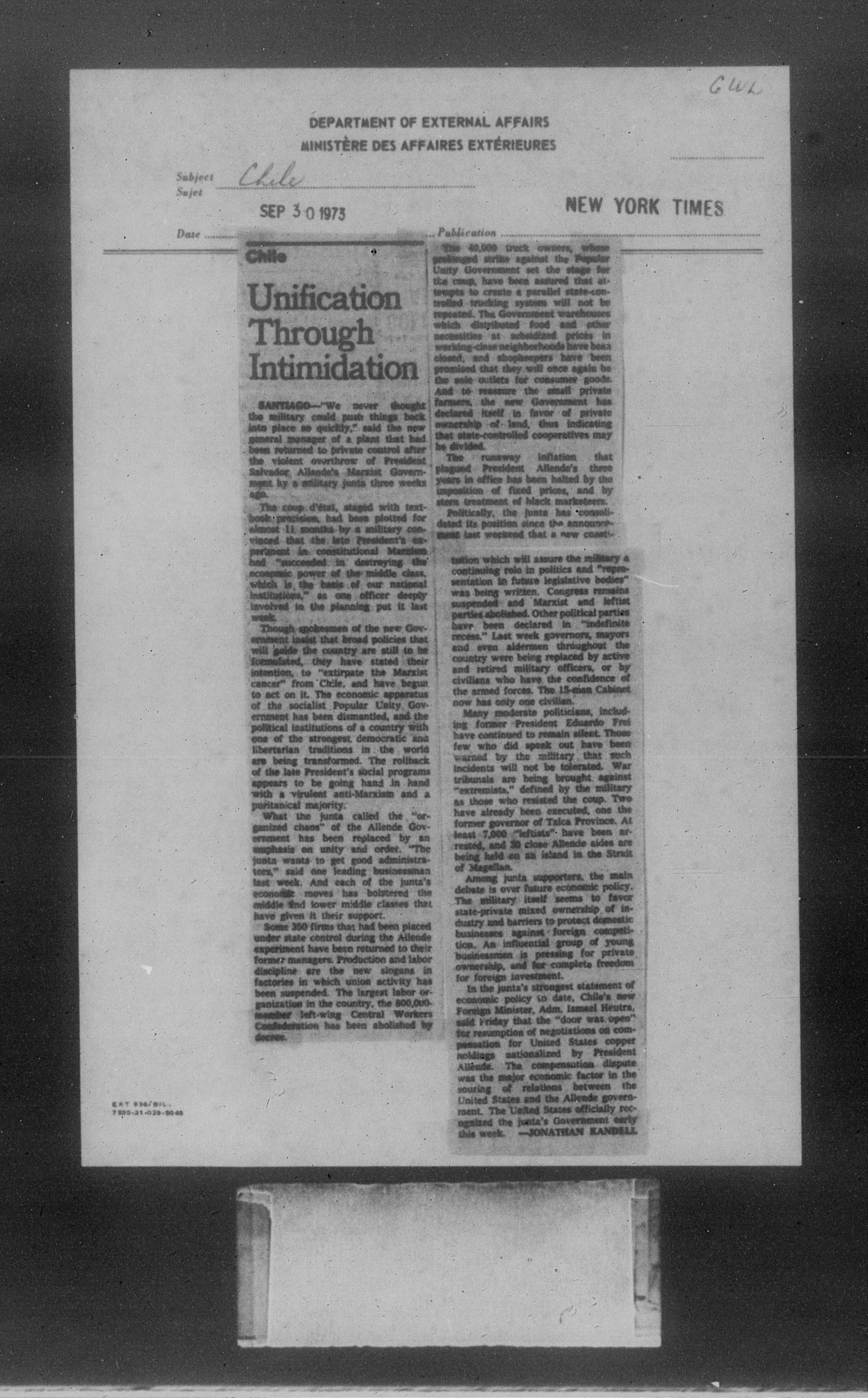 Department of External Affairs Library : newspaper clippings and manuals - 7769