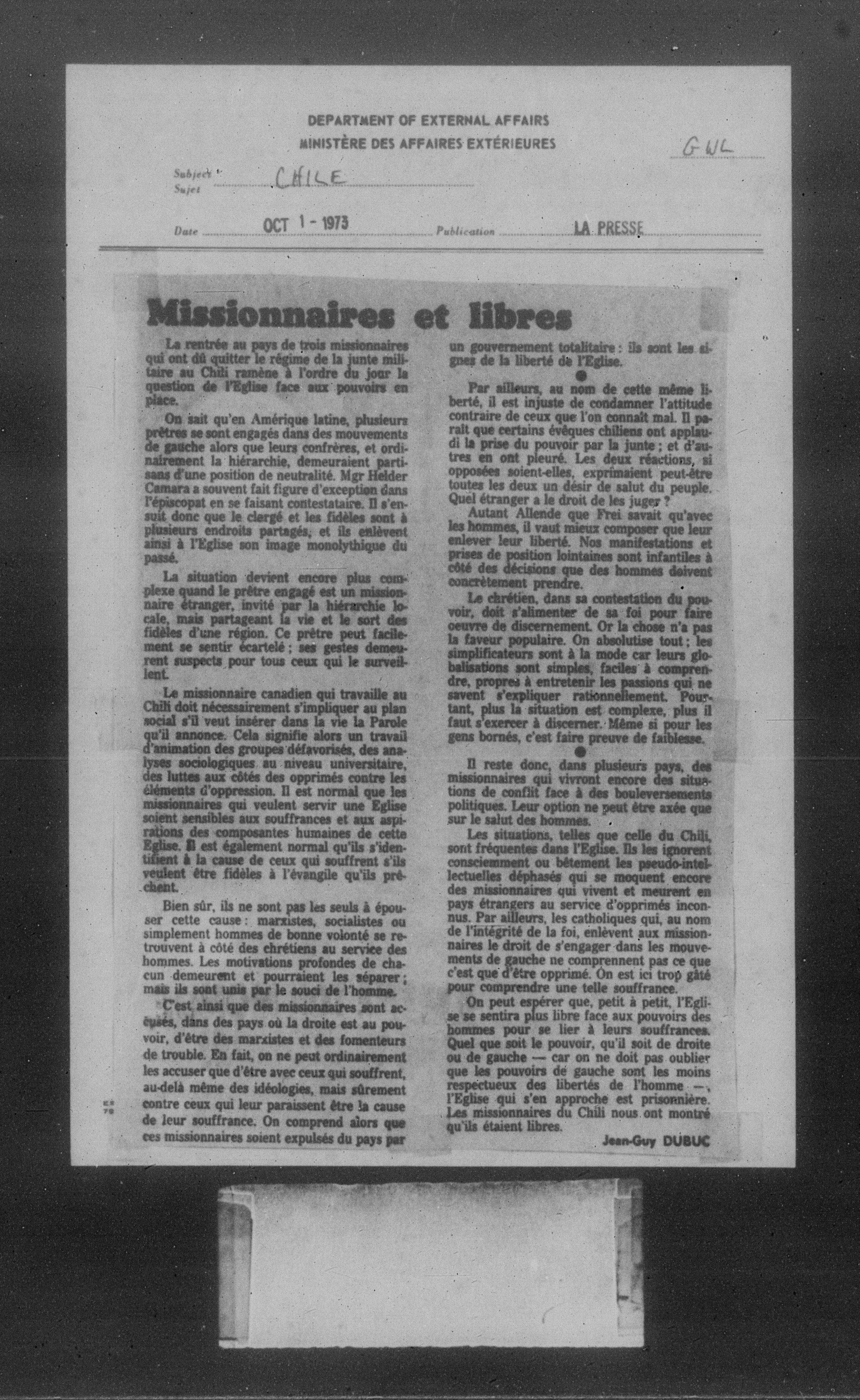 Department of External Affairs Library : newspaper clippings and manuals - 7769