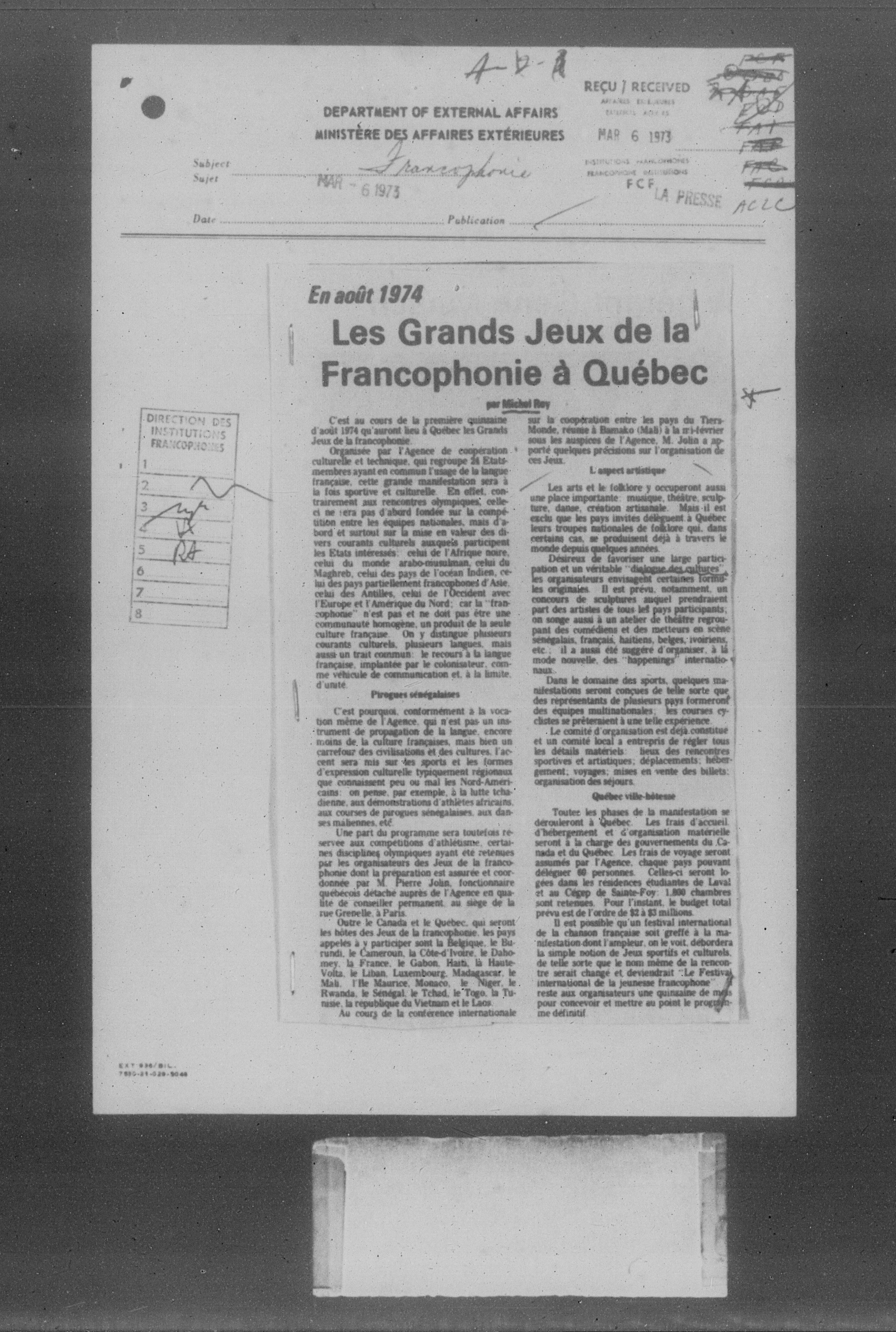 Department of External Affairs Library : newspaper clippings and manuals - 7773