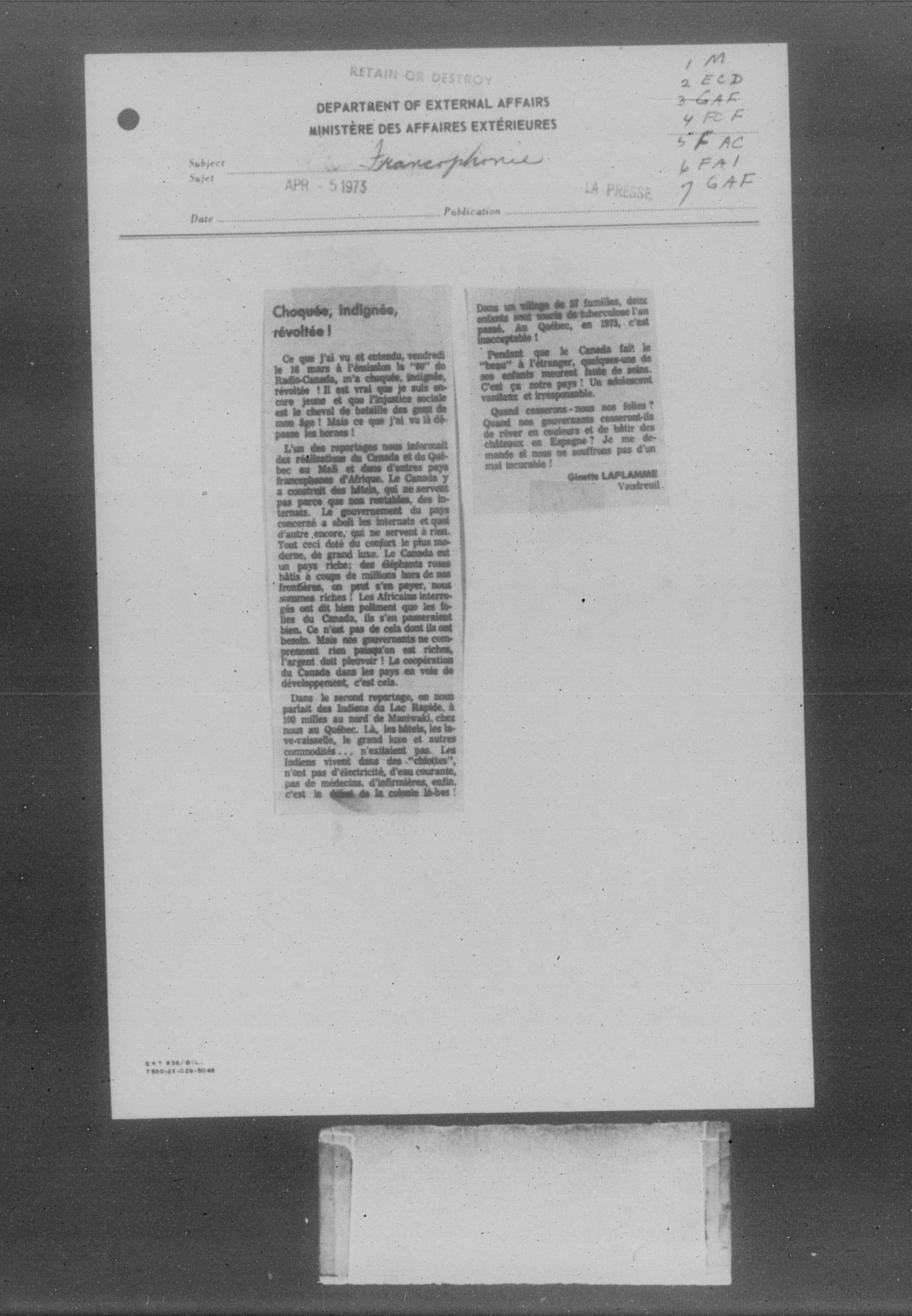 Department of External Affairs Library : newspaper clippings and manuals - 7773
