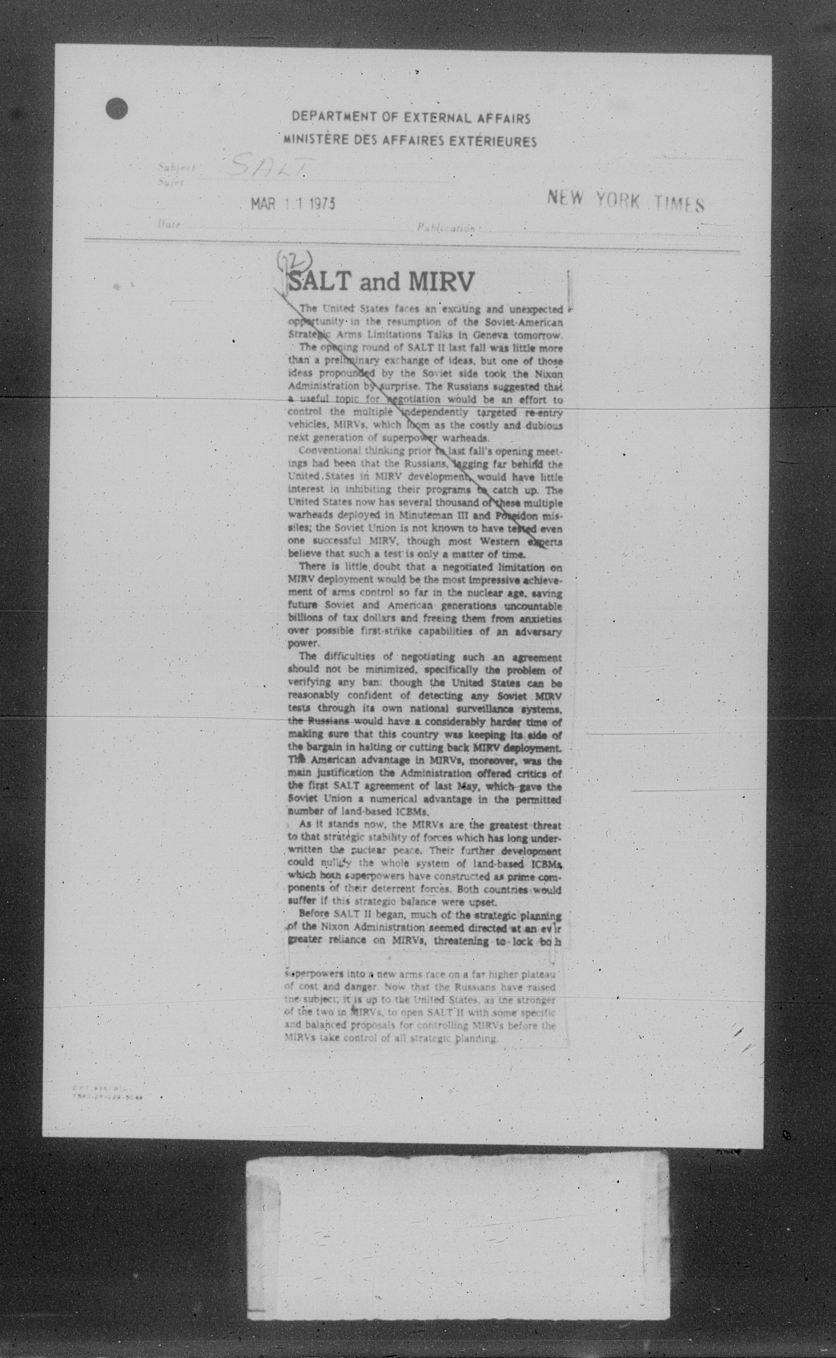 Department of External Affairs Library : newspaper clippings and manuals - 7781