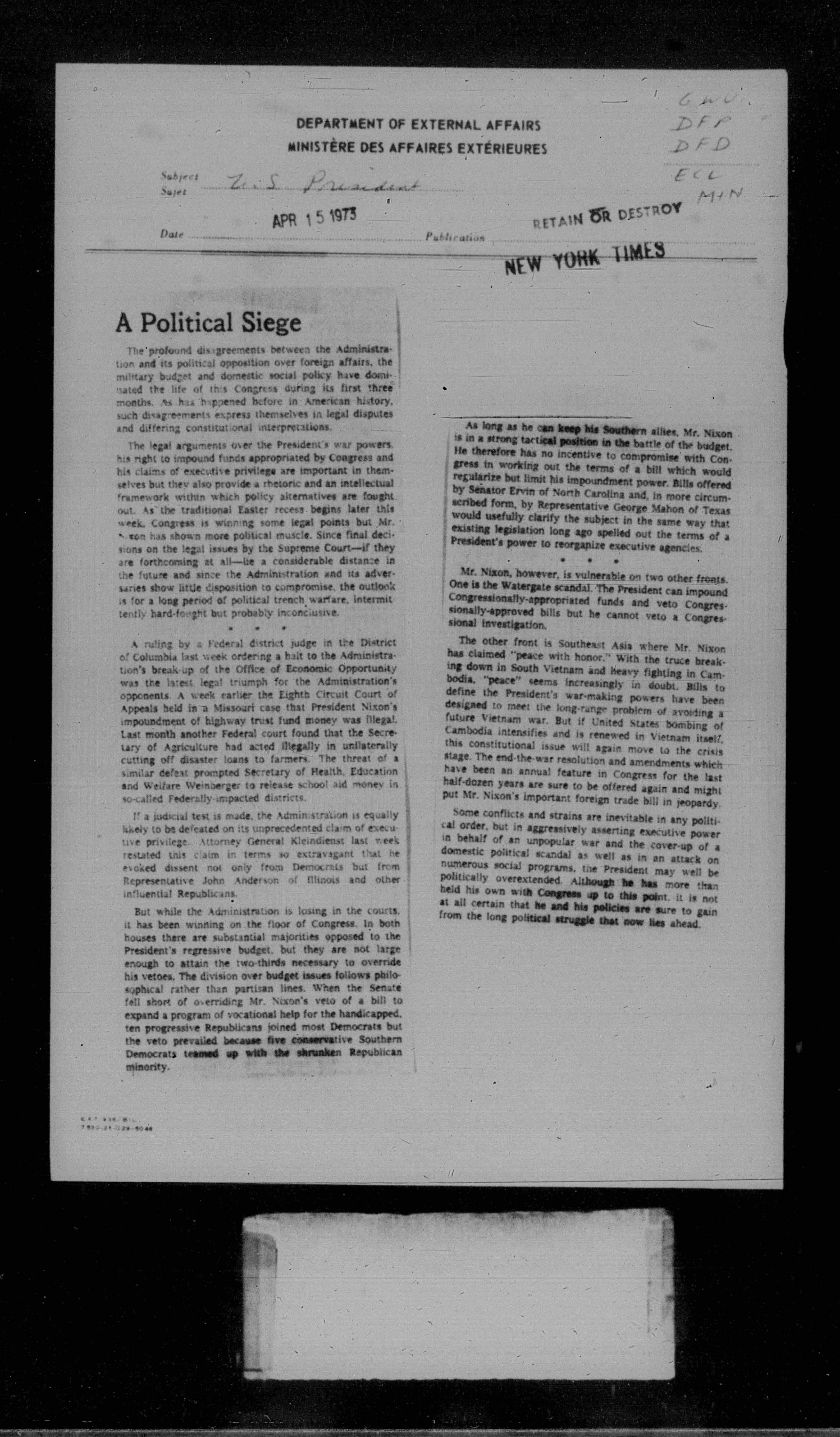 Department of External Affairs Library : newspaper clippings and manuals - 7784